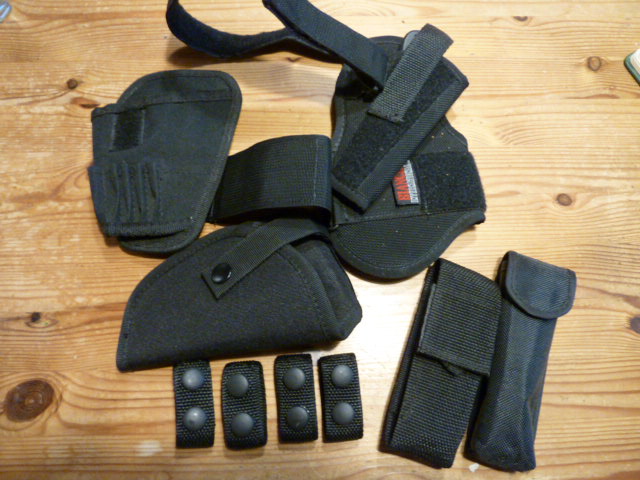 Hallo, biete aus Nachlass 3x Holster, kleine Revolver 2" - max. 2 1/2" Gürtelhalter und Taschenlampen Halterung - die Holster sind aus Cordura, von Bianci ein Beinholster sehr gut und Gürtel-Halterungen für Übergürtel, Taschenlampenetuis für Gürtel usw.....Gebrauchsspuren, bei dem Holster für Revolver und Patronen fehlt die Halterung/Sicheurng der Waffe ...... der Standartsatz - keine Garantie, Gewährleistung, Rücknahme - ragen bitte vor dem Bieten - nicht nacher feststellen was nicht passt.