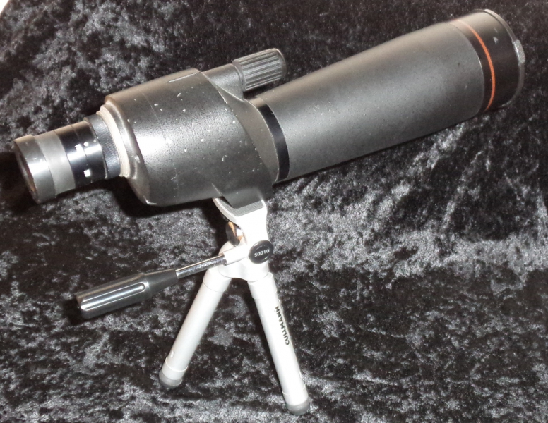 Exacta Spektiv 15-45, Cullmann Dreibein ist dabei. Okular ist abschraubbar und es ist ein großes Gewinde für Kameras vorhanden. Einblick ist gerade.