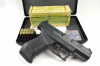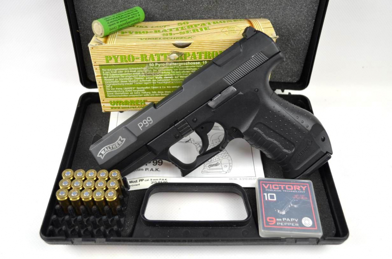 Walter P99 im originalen schwarzen Walther-Koffer, originaler Pyrobecher (nicht im Bild), mehrsprachiger Gebrauchsanweisung, 10 Victory Pfefferpatronen, 15 Messing Platzpatronen (ohne Gitter), 17 Pyro-Ratterpatronen. Kein weiteres Zubehör.