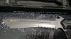 Die Integralklinge ist titanbeschichtet und hat eine Stärke von 6 mm. Sie ist mit einem Teilwellenschliff und einer Anreisssäge versehen und am Griffende als Glasbrecher ausgeformt.