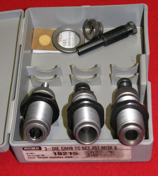 Zum Verkauf kommt ein RCBS, Grau, Matrizensatz in 357 M / 38 S mit Hülsenhalter