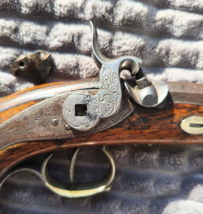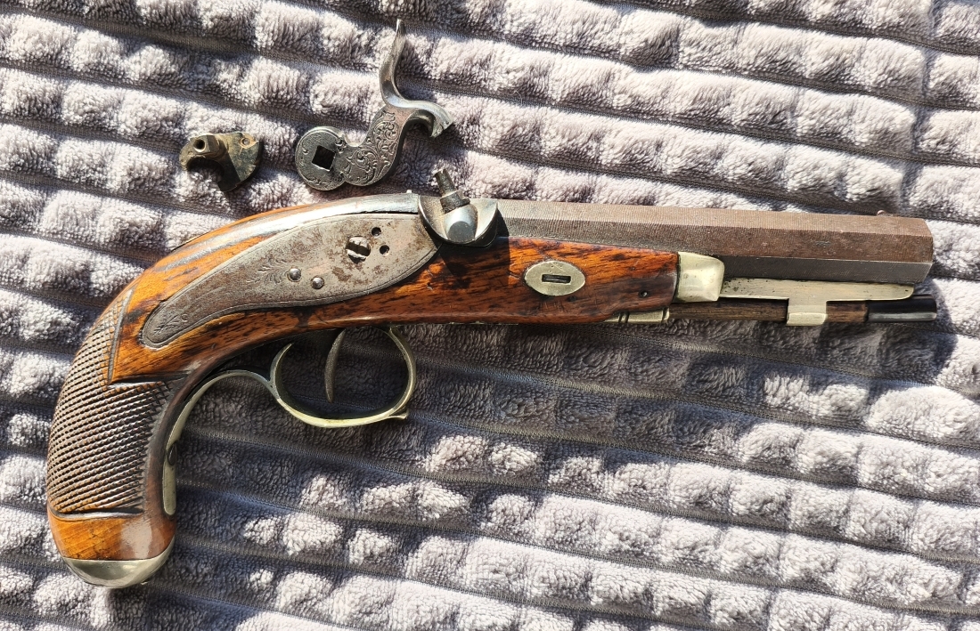 Braunierter achtkantiger Damastlauf, gezogen, Kal. ca. 11mm. Nussholzhalbschaft mit gravierter Neusilbergarnitur. Pistonfach aufklappbar. Beidseitig geschnittene Fischhaut. Feststehende Visierung. Perkussionsschloß, leicht graviert, innen komplett, Hahn und aussenliegendes Nussteil fehlt (Restaurierungsobjekt). Holzladestock mit Horndopper. Gesamtlänge ca. 26cm.