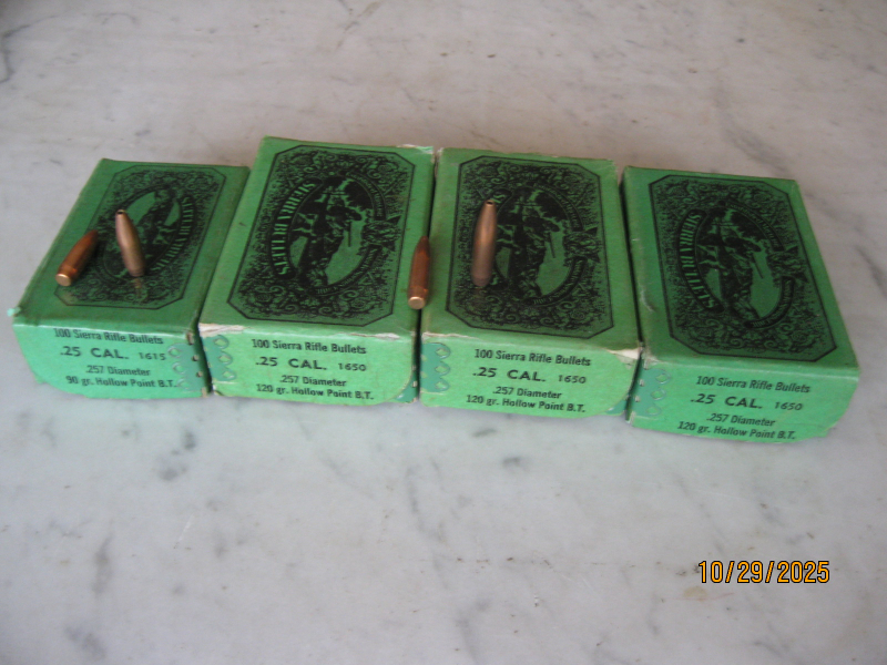 400x Sierra Cal.25 Geschoße. 300x 120grain Hollow Point Boat Tail. 100x 90grain Hollow Point Boat Tail. Gebrauchtware, keine Garantie, kein Umtausch.