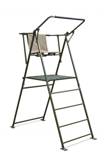 Der bequeme Sitz ist wasserfest und mit einer stabilen Rückenlehne ausgestattet. Der Sitz lässt sich bei Bedarf bzw. Nichtbenutzen wegklappen, sodass die Fußbodenfläche des Drückjagdbocks besser genutzt werden und die Sitzfläche nicht verschmutzen kann.