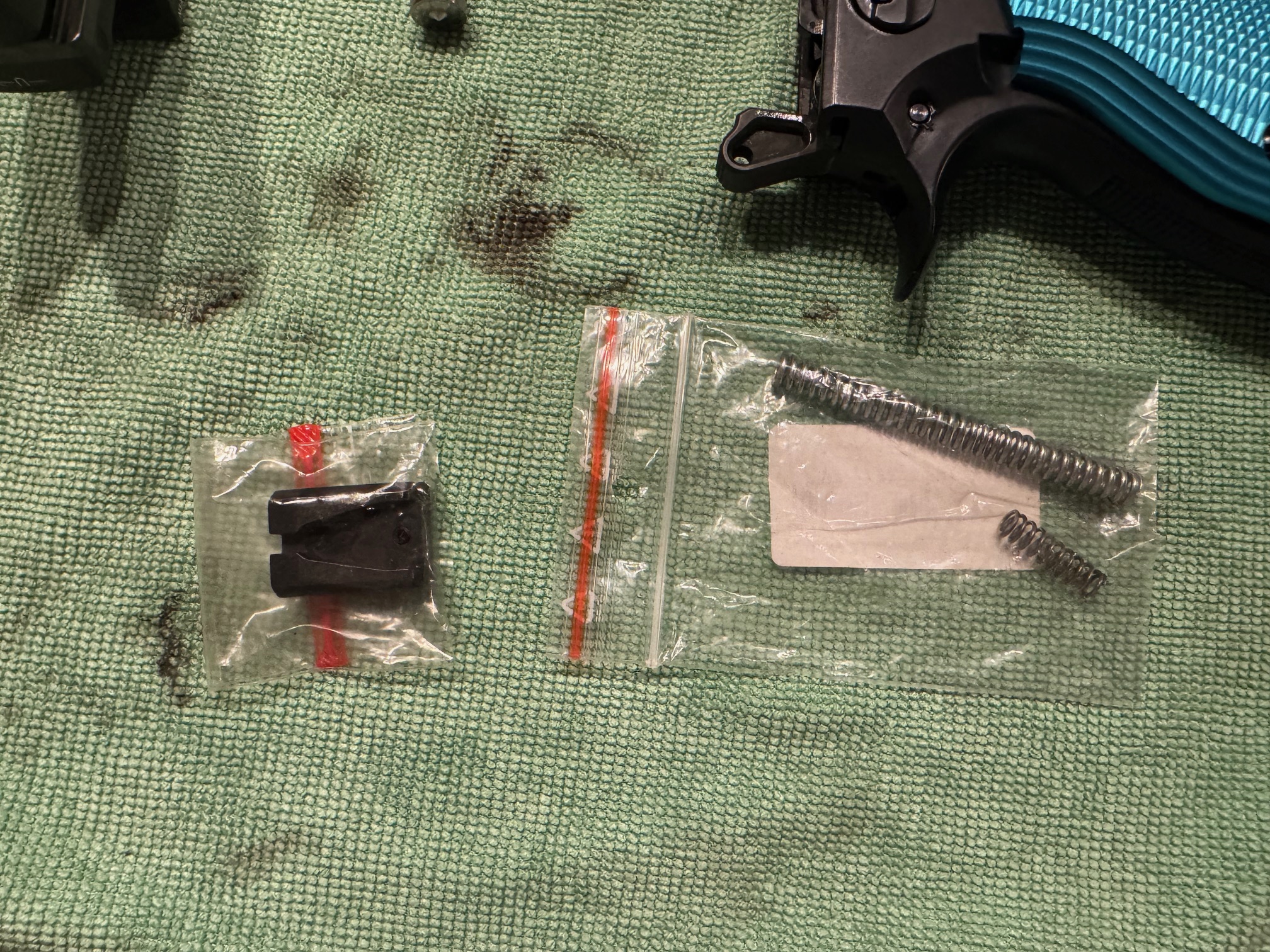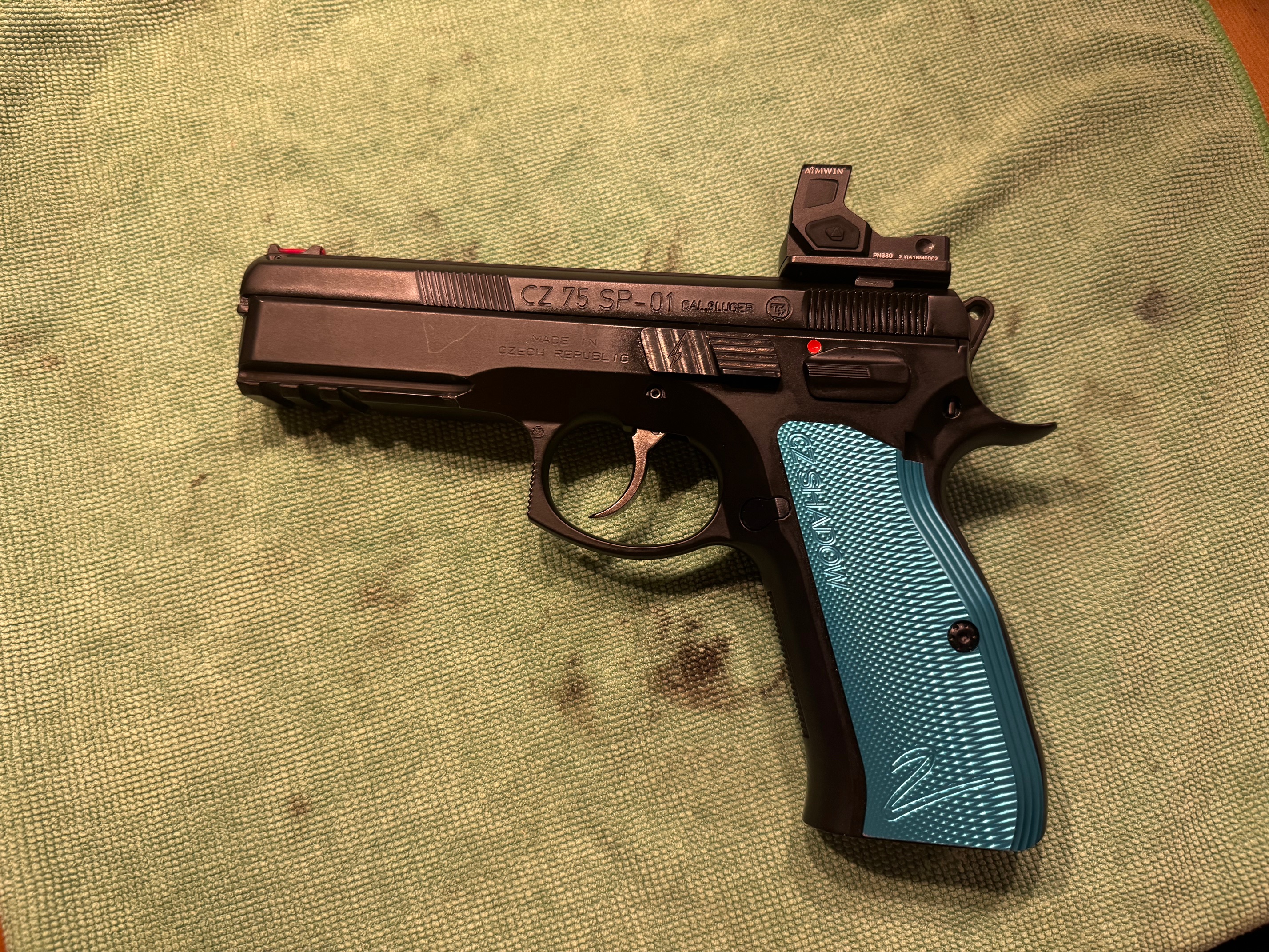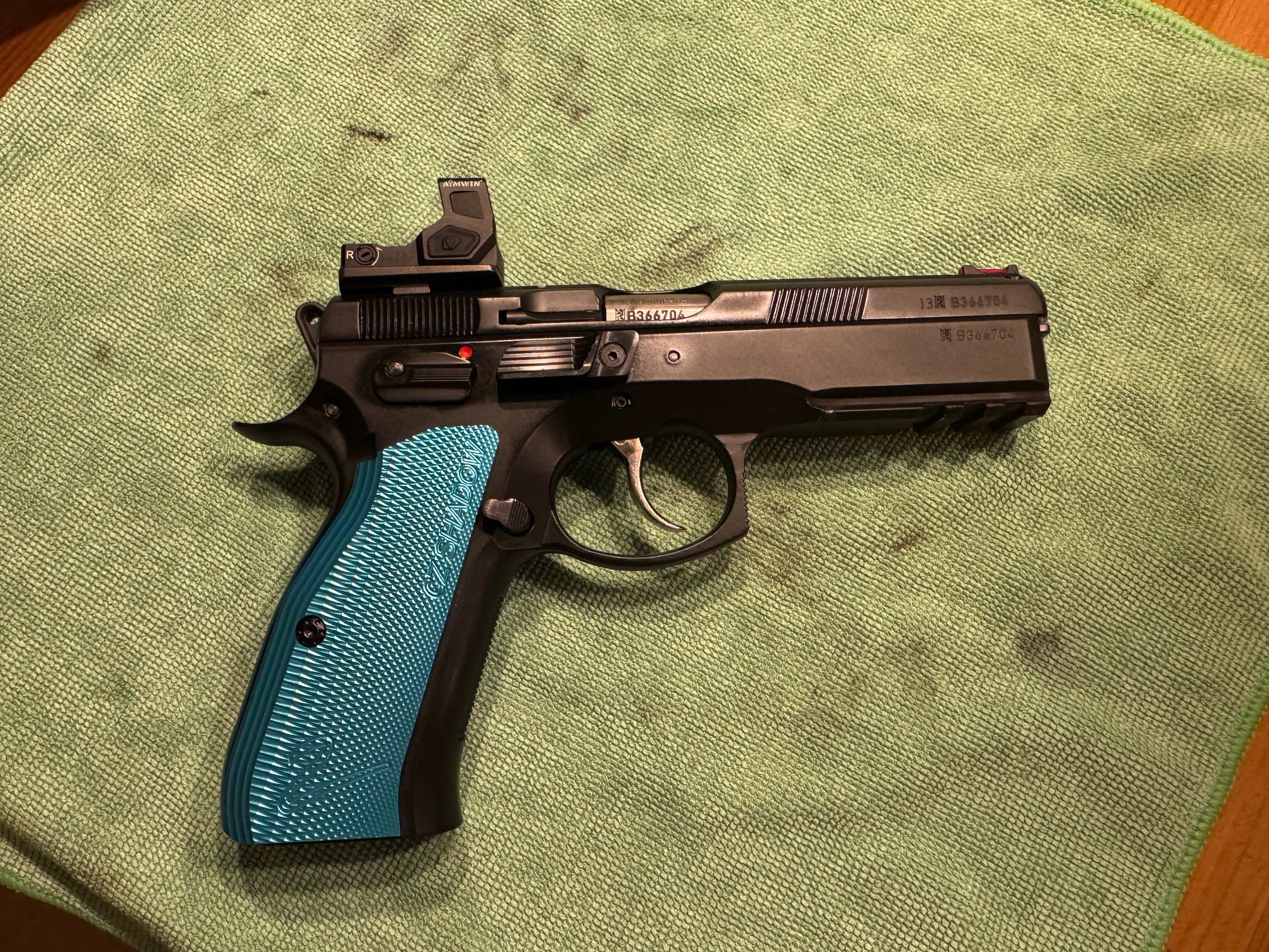 Da ich linkshänder bin, habe ich einen beidseitigen Verschlussfanghebel von cz-parts.com dazugekauft und auch den Magazinauswurfknopf auf die andere Seite gedreht. Es ist beides problemlos wieder umkehrbar. Das Reddot wurde mit der passenden Montageplatte in den Verschluss getrieben und sitzt bombenfest. Die original Kimme ist auch noch vorhanden. Ich habe vor kurzem die Tuningfedern für weniger Abzugsgewicht eingebaut und die originalen sind auch mit dabei. Es handelt sich um das Modell mit DA/SA Abzug also Double-Action. Die blauen Griffschalen habe ich nachgekauft, die originalen schwarzen sind auch dabei. Den Koffer und 2 Magazine gebe ich natürlich auch mit.
