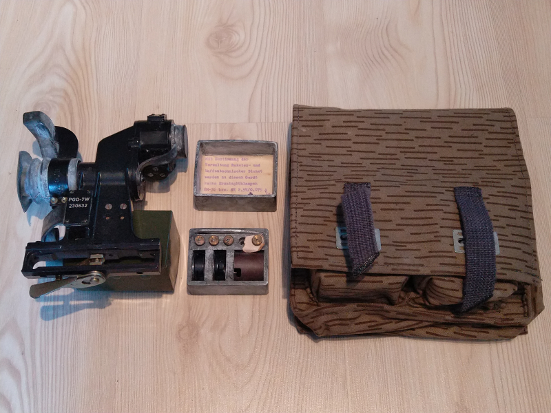 Ein Zielfernrohr PGO-7W für die leichte Panzerbüchse RPG-7. Lizenzfertigung aus Bulgarien (OMZ, Sofia). In der DDR für die dimmbare Beleuchtungseinheit umgearbeitet. Dabei wurde auch die Plakette mit der Seriennummer ausgetauscht. Folgendes Zubehör ist dabei: Tragetasche, Beleuchtungseinheit, Zubehörkästchen mit Lichtfilter gelb + grau, Wetterschutzblende, Schraubendreher / Klemmschlüssel, 4x Glühlampe SM. Absehen ist klar. Ausgezeichneter Zustand. Alle Gummiteile mit Talkum eingepudert.