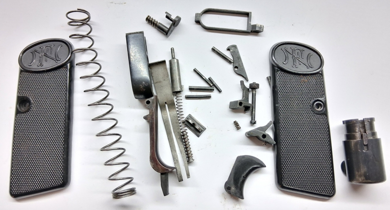 Angeboten ist ein Konvolut Ersatzteile Kleinteile für FN 1910 / 22 Modell 22 7,65mm Browning, Griffschalen, Riegelstift, Schlagbolzen, Auszieher, Abzugstollen, Magazinsicherung, Griffsicherung, Abzugsfeder, Magazinhalter, Sicherung, Abzug, Laufführungsring, Magazinhalter, Teilesatz.