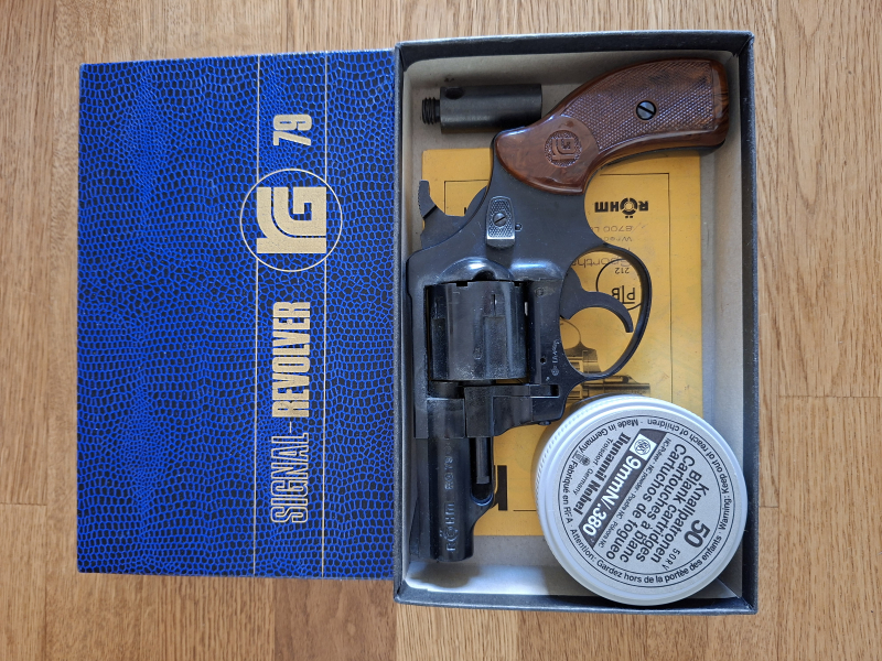 Hausfund :Revolver von Röhm RG79 Kal 9mm mit Patronen ca 50 St.-Beschreibung -Signalbecher und OVP.