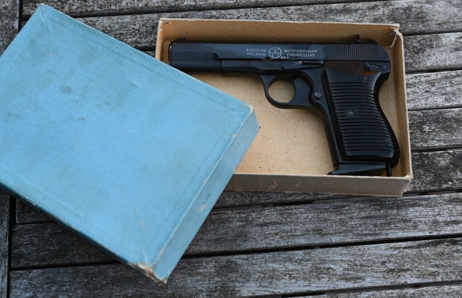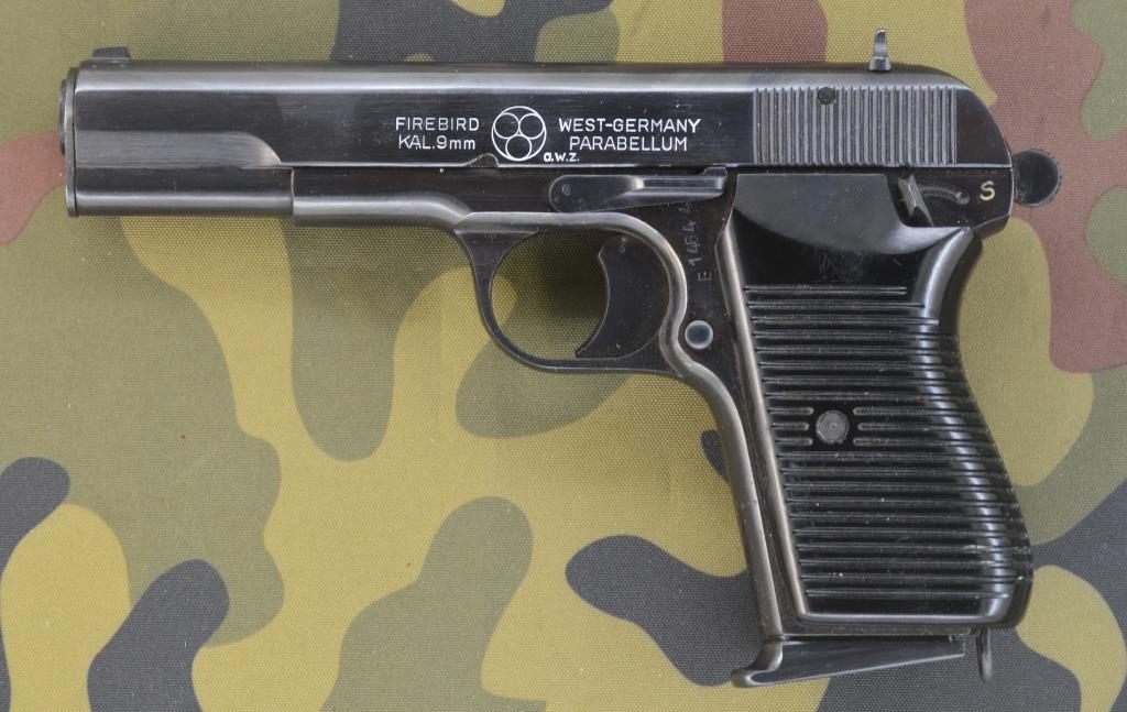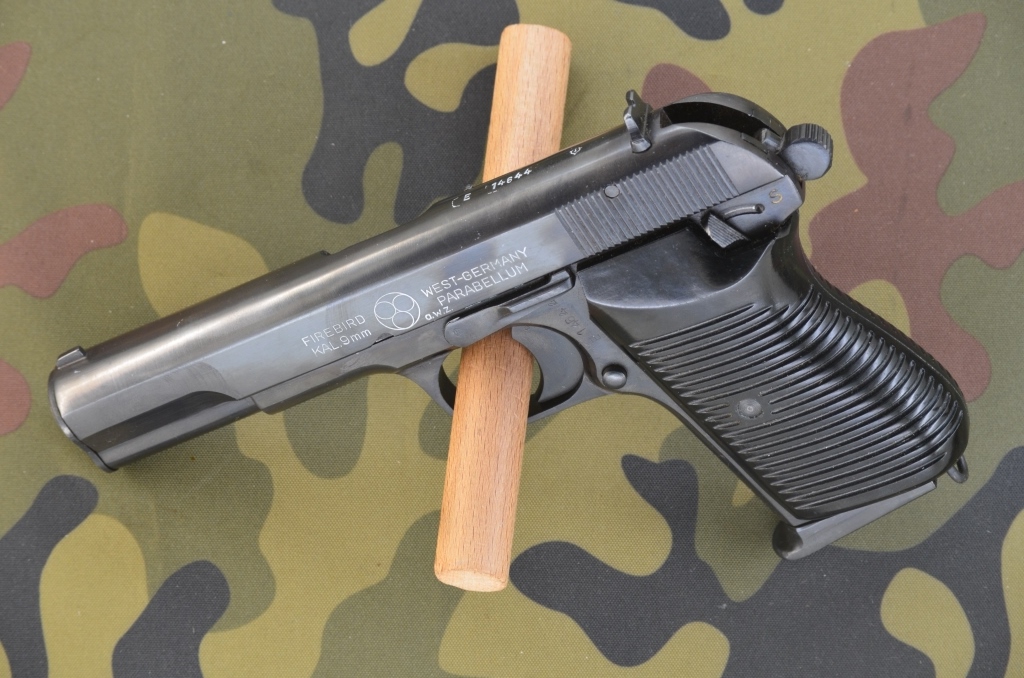 Markenlogo "FIREBIRD, WEST-GERMANY a.w.z.", Kaliberangabe "9 mm Parabellum", Seriennummer "E14644", diverse winzige Prüfzeichen, wie oft aus Ostblockwaffen vorfindlich. Bundesrepublikanische Beschusszeichen von 1970. Importeurzeichen "HEGE". Auf mehreren Teilen winzige Ziffer "02", ein Indiz für seinerzeit innerhalb des Warschauer Pakts in Ungarn gefertigte Waffen.