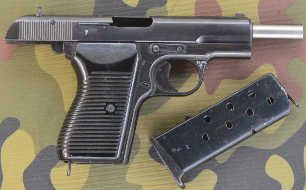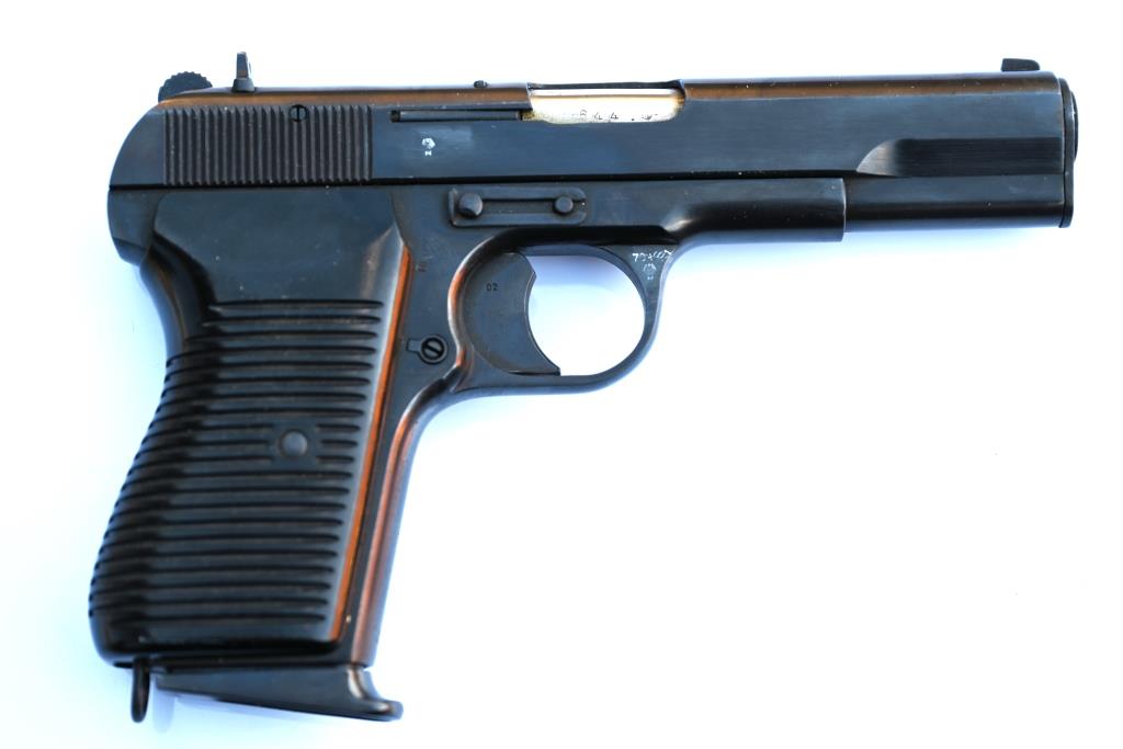 Selbstladepistole, Sammlerwaffe, Pistole mit Single-Action-Abzug und außenliegendem Hahn, Armeewaffe, Klon einer Ordonnanzpistole des ehemaligen Ostblocks, aus dem Kalten Krieg: