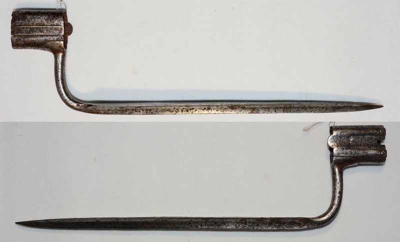 Original Tüllenbajonett für doppelläufige Vorderladerwaffe, um 1800, sicher für kleines Kaliber, denn die Innenabstände in der Tülle sind verhältnismäßig gering, Klingenlänge 27,5 cm, für eine Waffe mit ca. 16,3 mm Laufaußendurchmesser an Mündung und Außenabstand der Läufe vorne 33 mm, grob gereinigte Rostoberfläche, keine Markierung