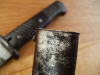 Die Klingenlänge beträgt ca. 253 mm und hat ganz geringe Rostfleckchen, dafür aber Schleifspuren auf der Schneide die Gesamtlänge ohne Scheide ca. 387 mm und mit Scheide ca. 406 mm.