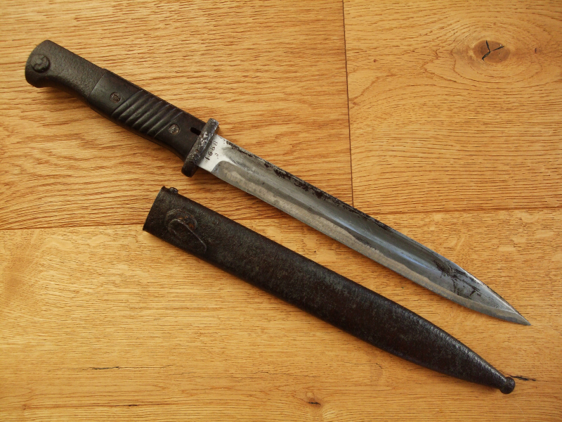 Zum Verkauf kommt ein Bajonett mit original dazugehöriger Scheide für den K 98. Beides sind mit dem Jahr 1939 gestempelt.