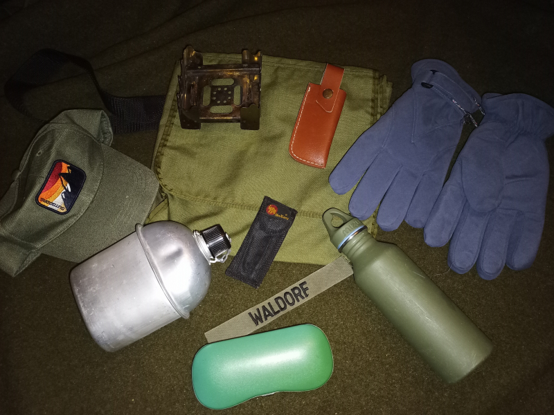 Camping, Outdoorsachen: Taschenkocher, Handschuhe DDR/NVA; Größe XL, Umhänge-Kartentasche US Army etc.