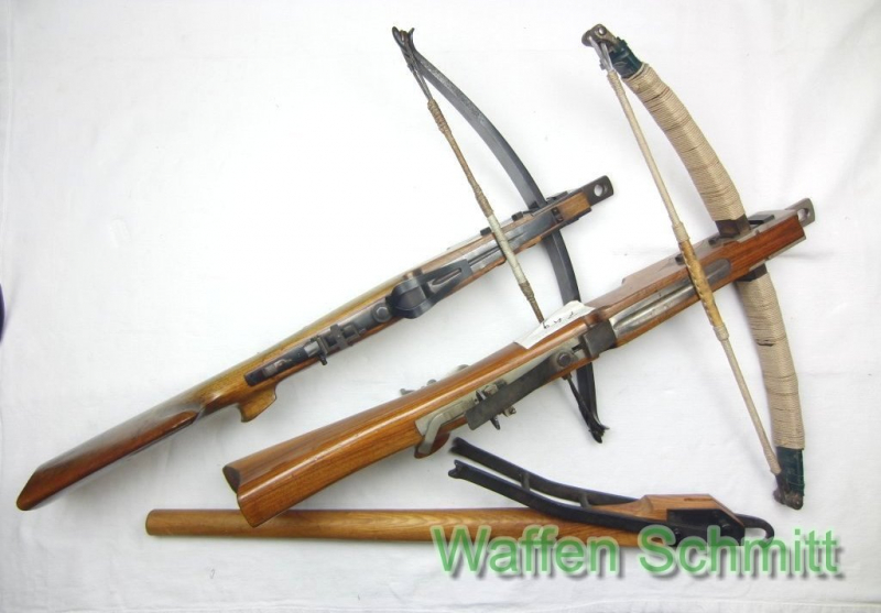 Sie bieten auf 2 historische Armbrüste mit verstellbarer Visierung inklusive Spannarm. Beide Armbrüste mit Nußbaumholzschaft, Sicherungsschieber und deutschem Stecherabzug. Hersteller einer Armbrust ist Ferd.Gareissen aus München, die andere ohne Herstellerbzeichnung. Die Herstellung war wohl Anfang 1900!!! Beschreibung