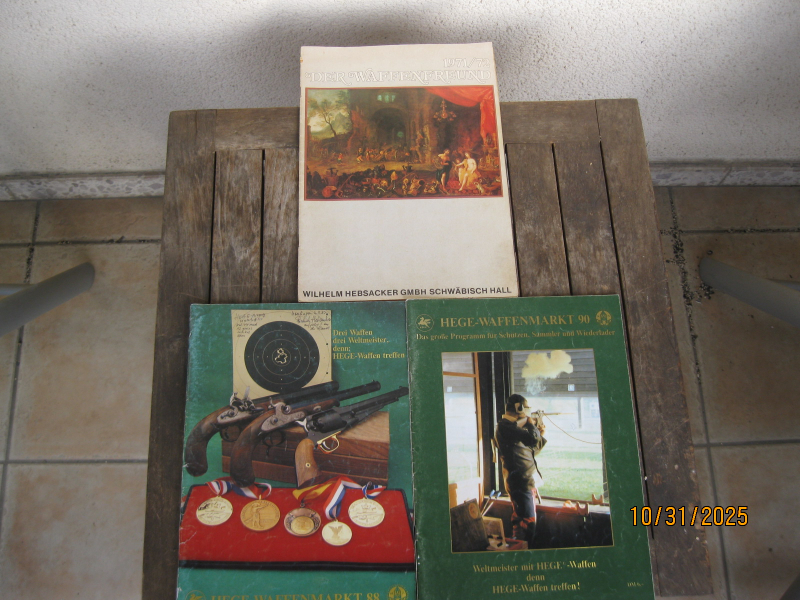 Hege Waffenmarkt 1988. 64 Seiten. 29x20cm. Hege Waffenmarkt 1990. 64 Seiten. 29x20cm. Hier wird bei den beiden Heften das komplette Hege Zeughaus Sortiment mit Preisliste, Abmessung, Gewicht etc. vorgestellt. Der Waffenfreund 1971/72. Hier werden alle Arten von Waffen mit Preisliste vorgestellt. Alle drei Hefte bunt bebildert. Gebrauchtware, keine Garantie, kein Umtausch.