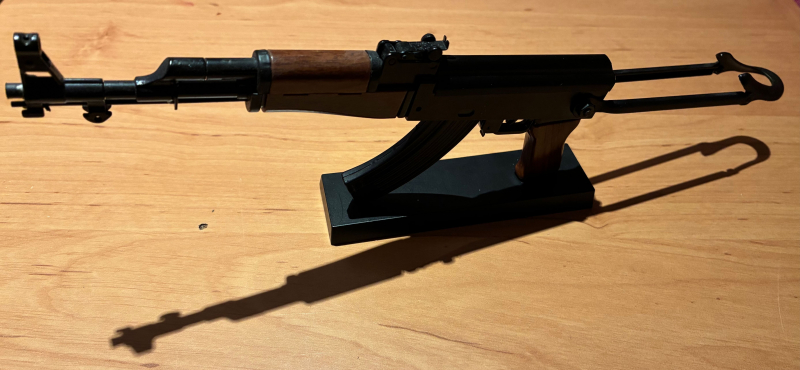 Sie bieten hier auf eine wunderschöne wertig verarbeitete Miniatur des legendären AK 47 Automat Avtomat Kalashnikow Sturmgewehres in der Variante für Fallschirmjäger mit einklappbarem Anschlagschaft.
