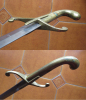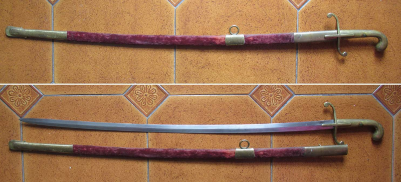 Ungarischer Beamtensäbel, leichte oder Salonausführung, für den Linkshänder (Rarität). Guter Zustand, die Feuervergoldung der Griffes und der Scheidenbeschlägen noch teilweise erhalten. Die Samtbezogene Scheide mit Stahlkorpus und drei Beschlägen. Ausgezeichnet erhaltene Klinge, ohne Markierung. Säbellänge: 96 cm, Klingenlänge: 78 cm, Klingenbreite: 25 mm.
