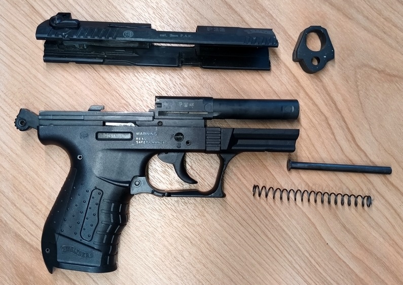 Walther P22 Schreckschuss Der Schlitten ist gebrochen Es werden nur die auf dem Bild zu sehenden Teile verschickt.