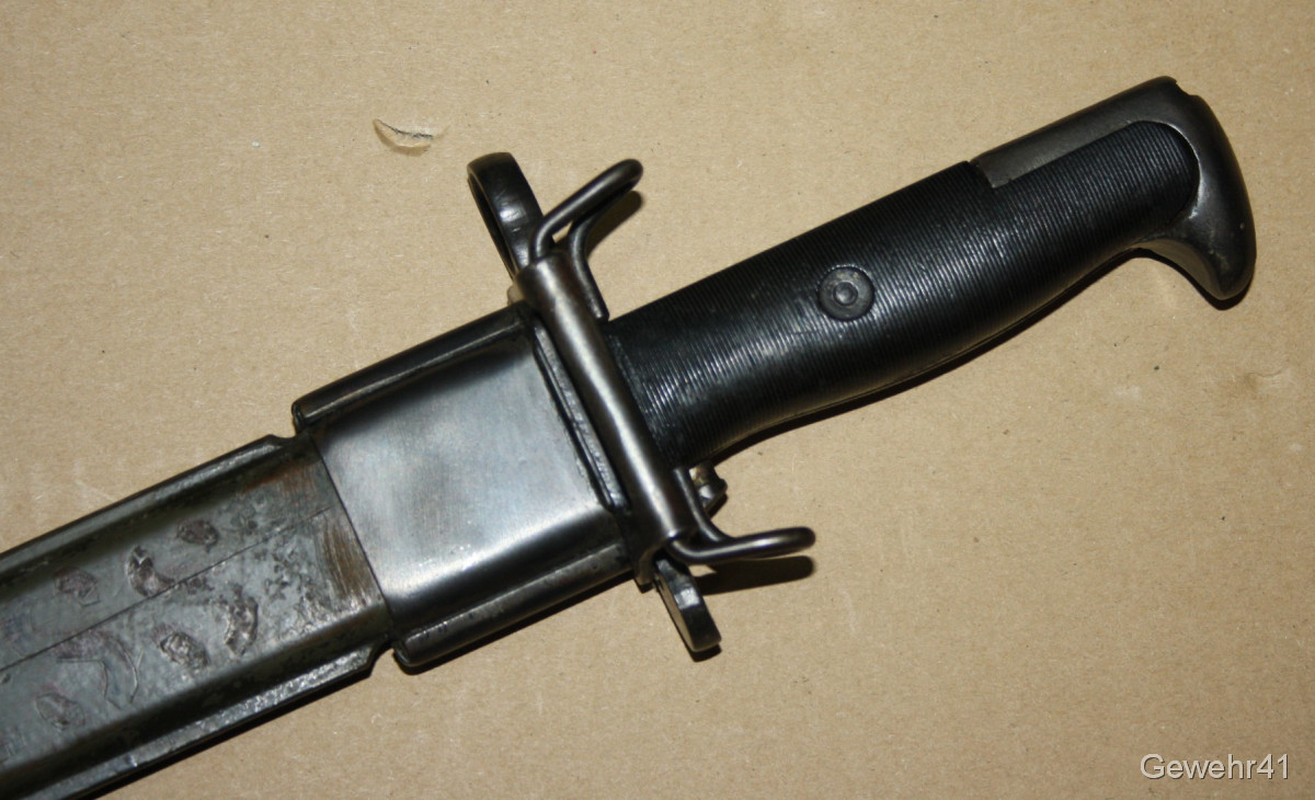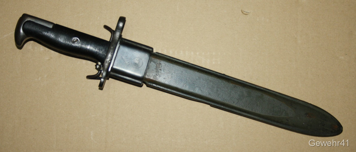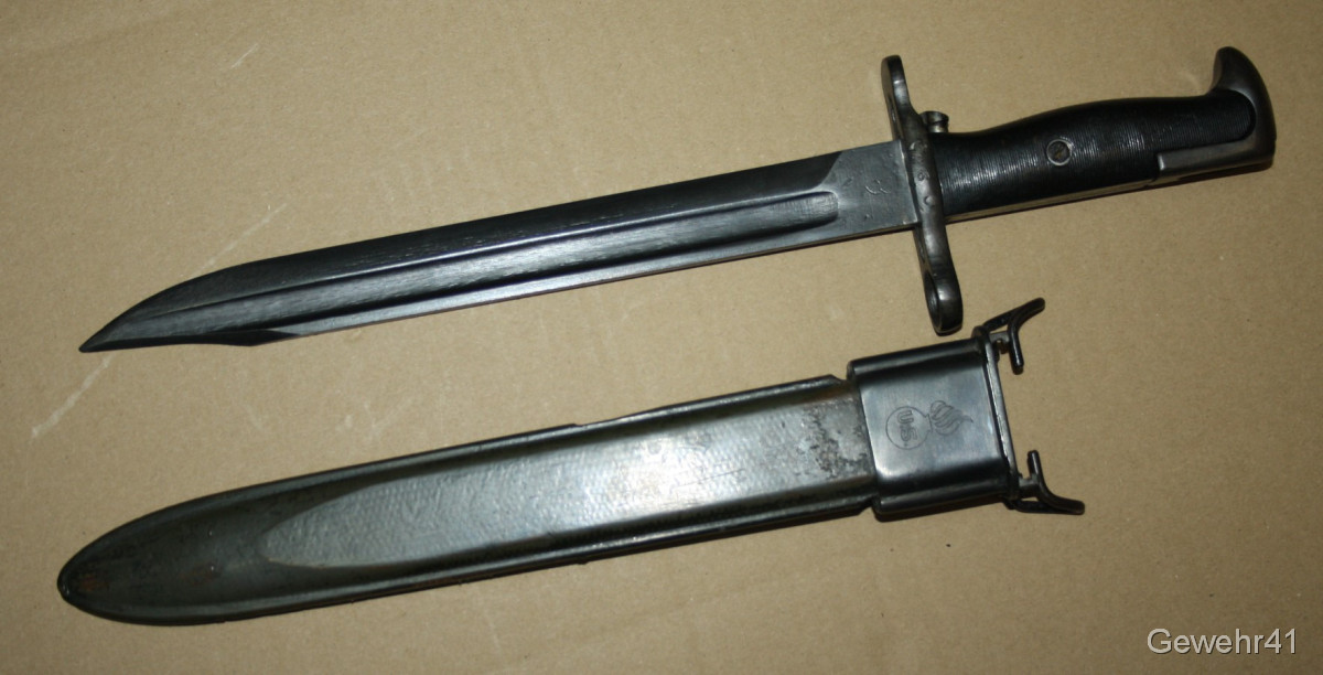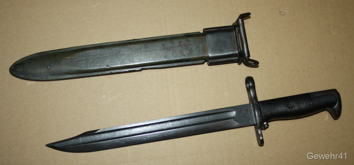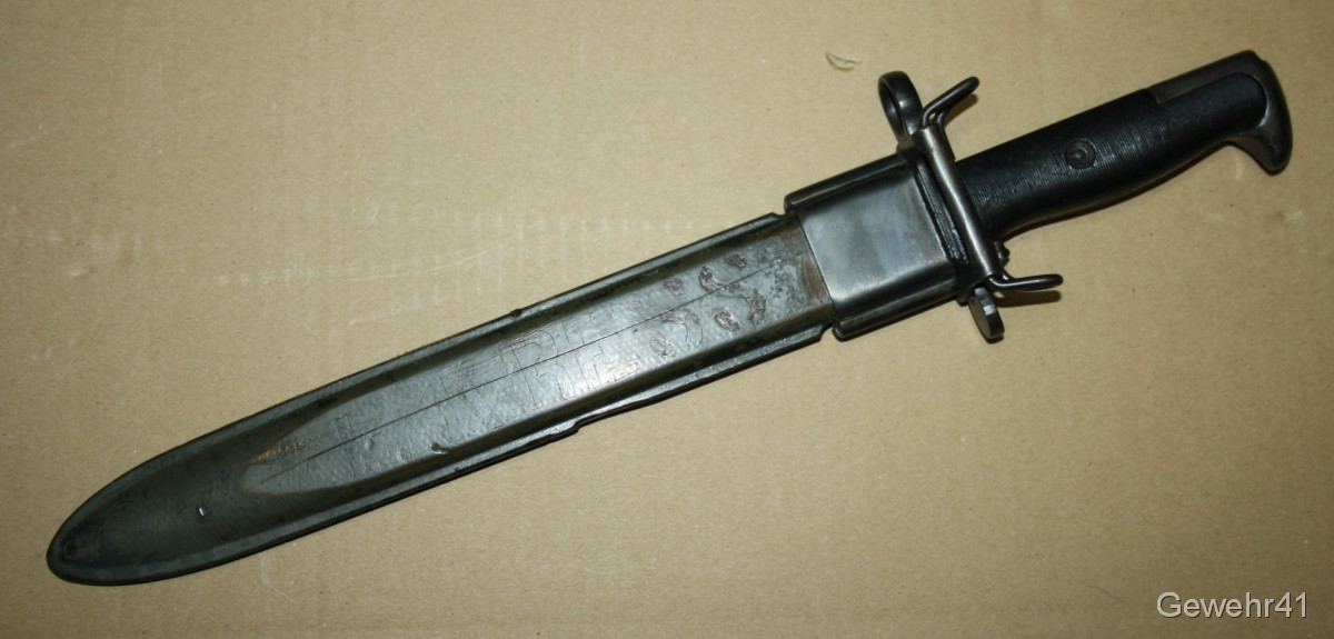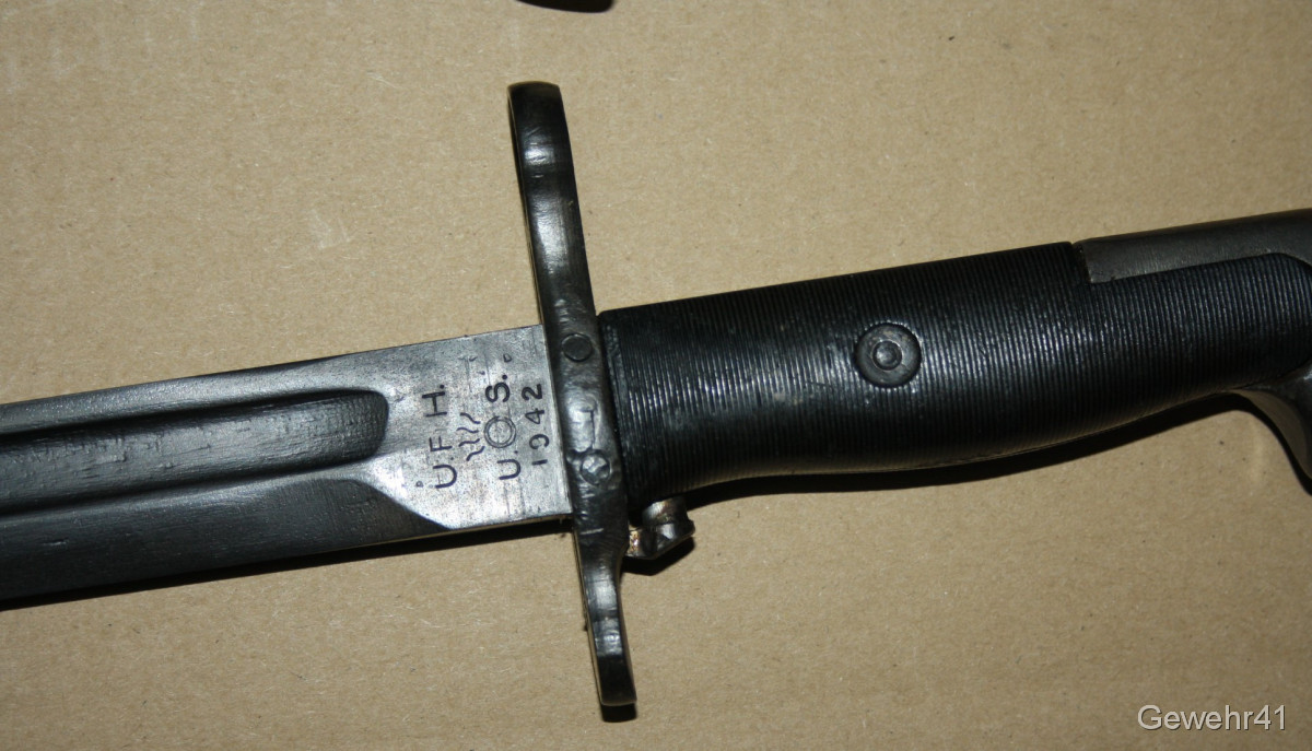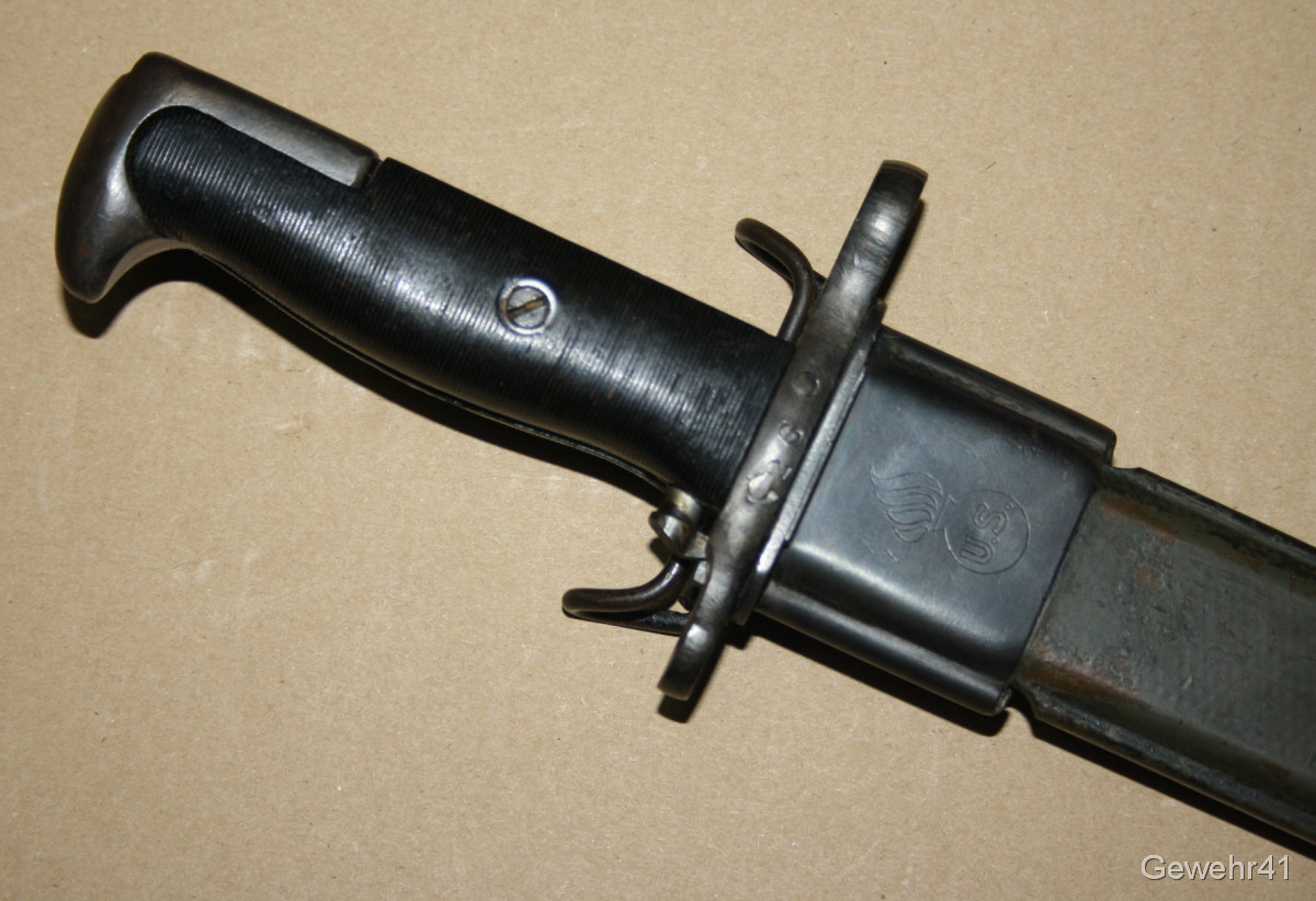 Sie bieten auf ein orig. US WK2 Bajonett für M1 Garand aus 1942er Fertigung. Seltenes Stück mit gekürzter Klinge im Bowie-Style im wirklich schönen Zustand. TOP!
