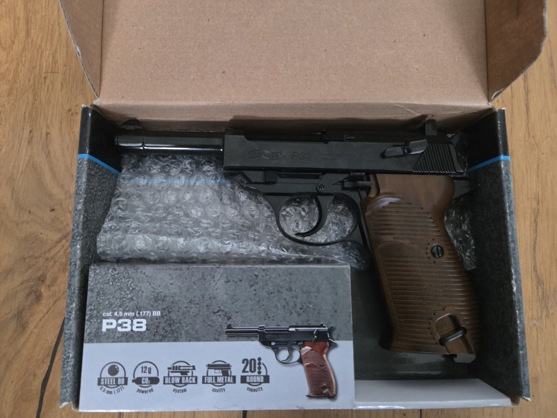 Verkaufe aus meiner Sammlung ein schwere Walther P38 im 4,5mm BB Full Metall co2 mit OVP. Die Waffe verfügt über eine realitätsnahe Blowback Funktion. Sie wurde mit ein paar Co2 Kaspel ausprobiert, ansonsten lag sie in der OVP im Schrank. Daher sehr guter Zustand mit minimalen Gebrsuchspuren. Die. Bilder sind Teil der Beschreibung. Ich versende nach Zahlungseingang und übersendung eines gültigen Altersnachweis bei nicht ID Mitgliedern versichert mit DHL.