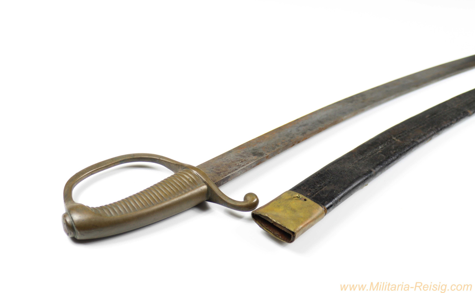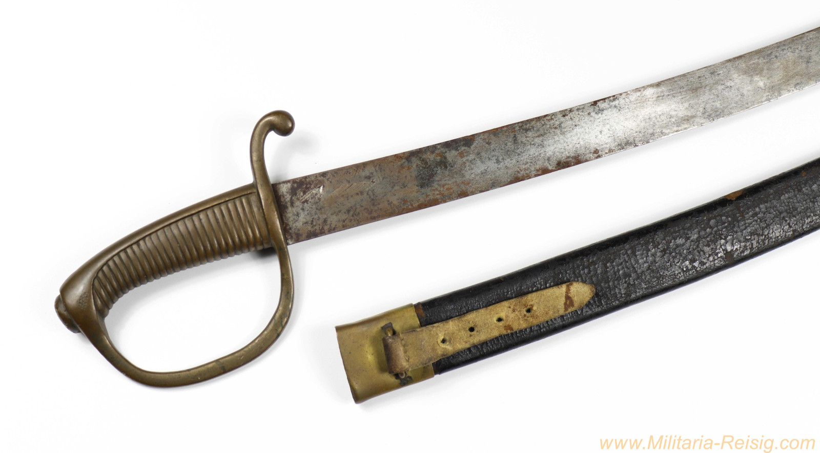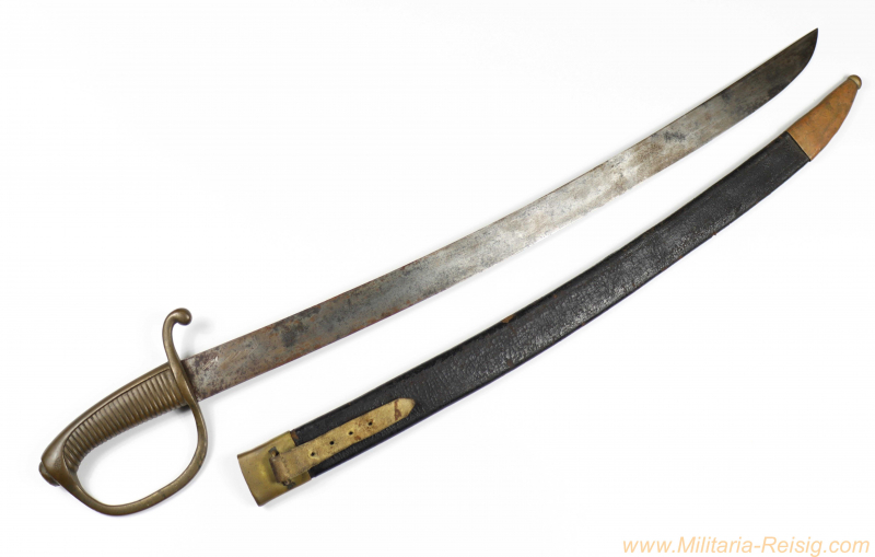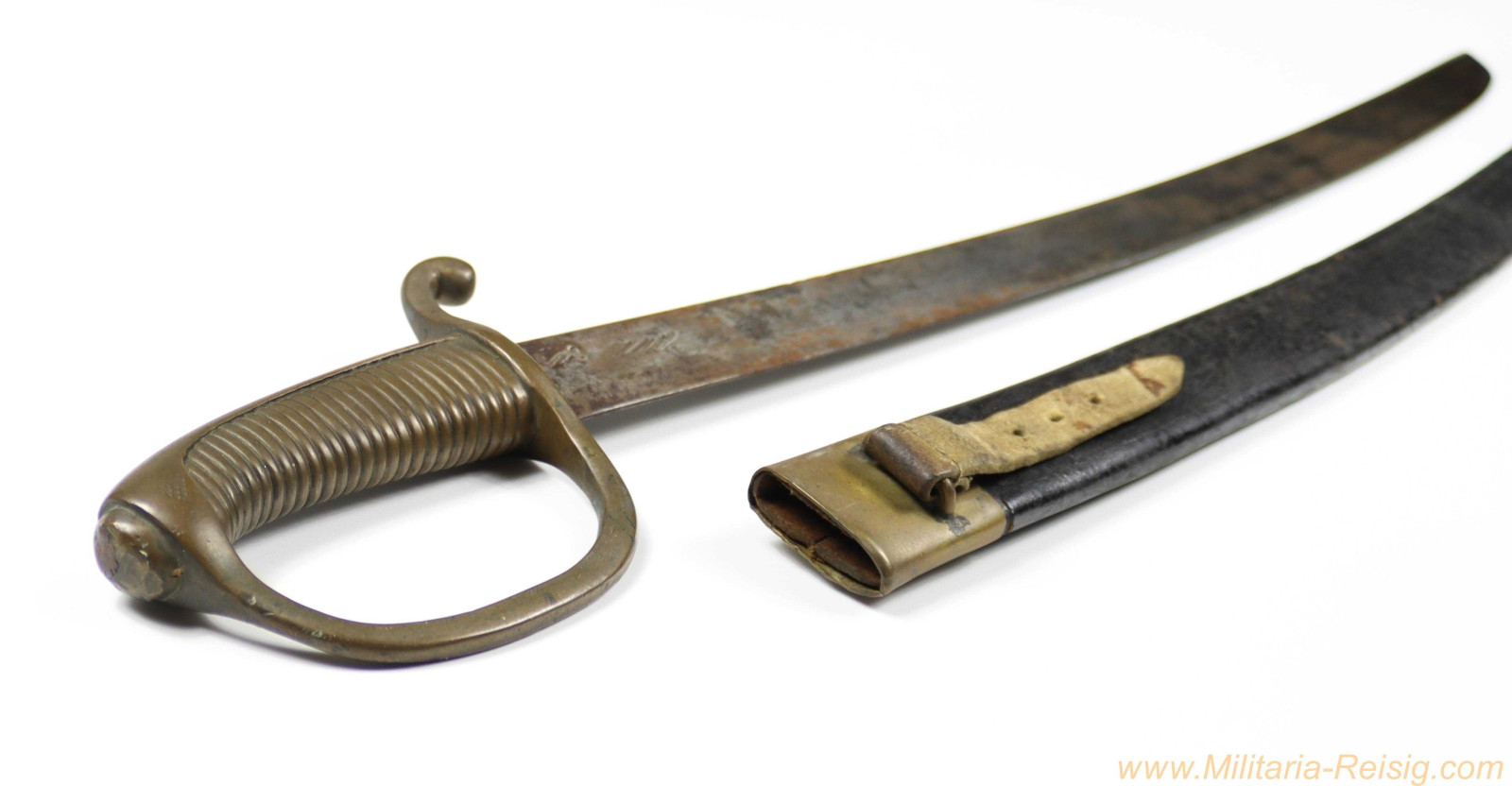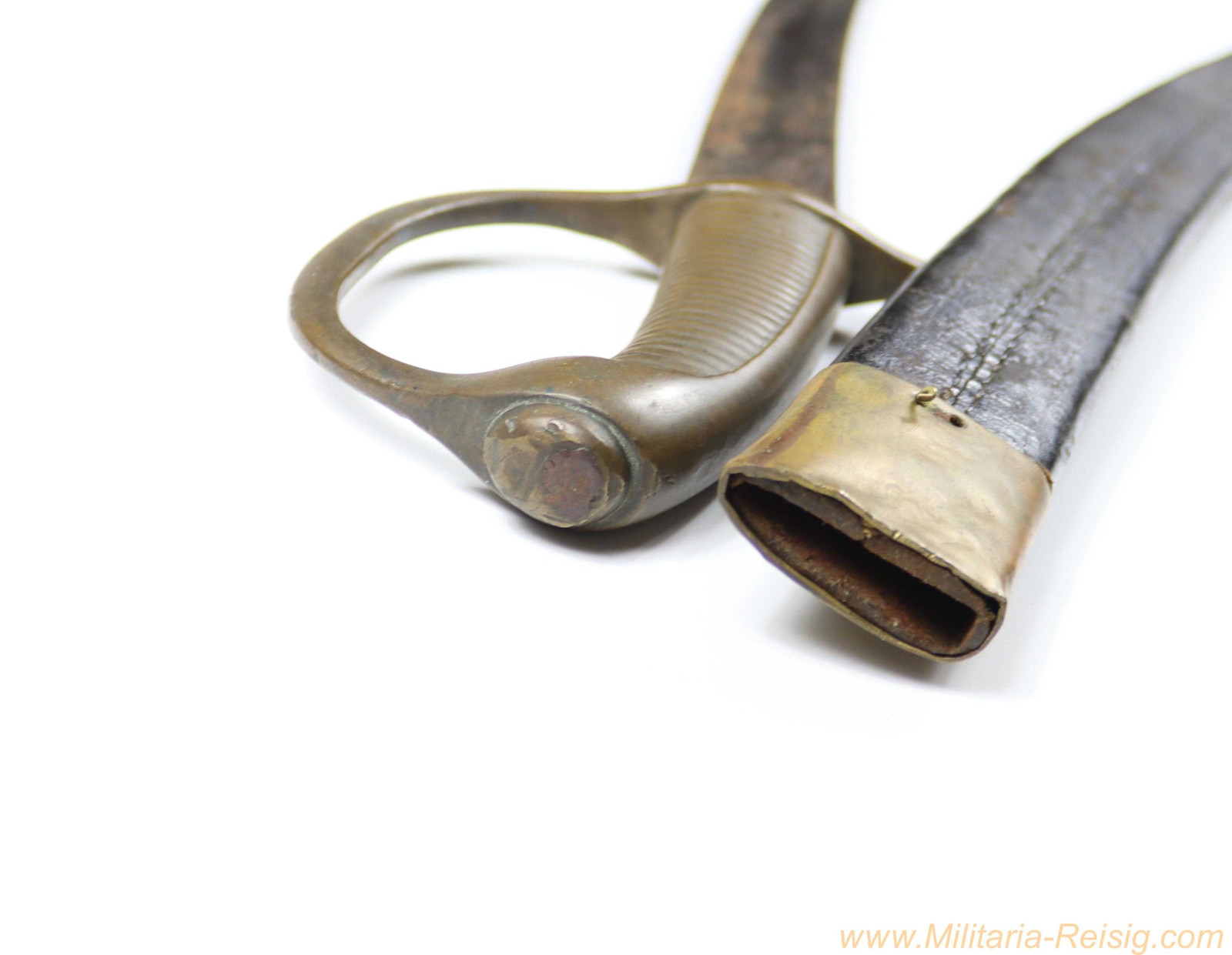 Schweizer Faschinenmesser bzw. Säbel Modell 1842/52 mit passender Lederscheide. Griff aus Messing mit gerilltem Griffstück, leicht gebogene Klinge mit typischer Alterspatina.
