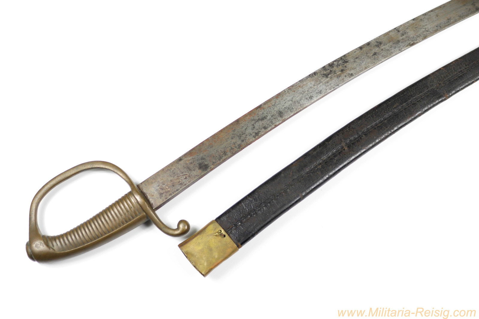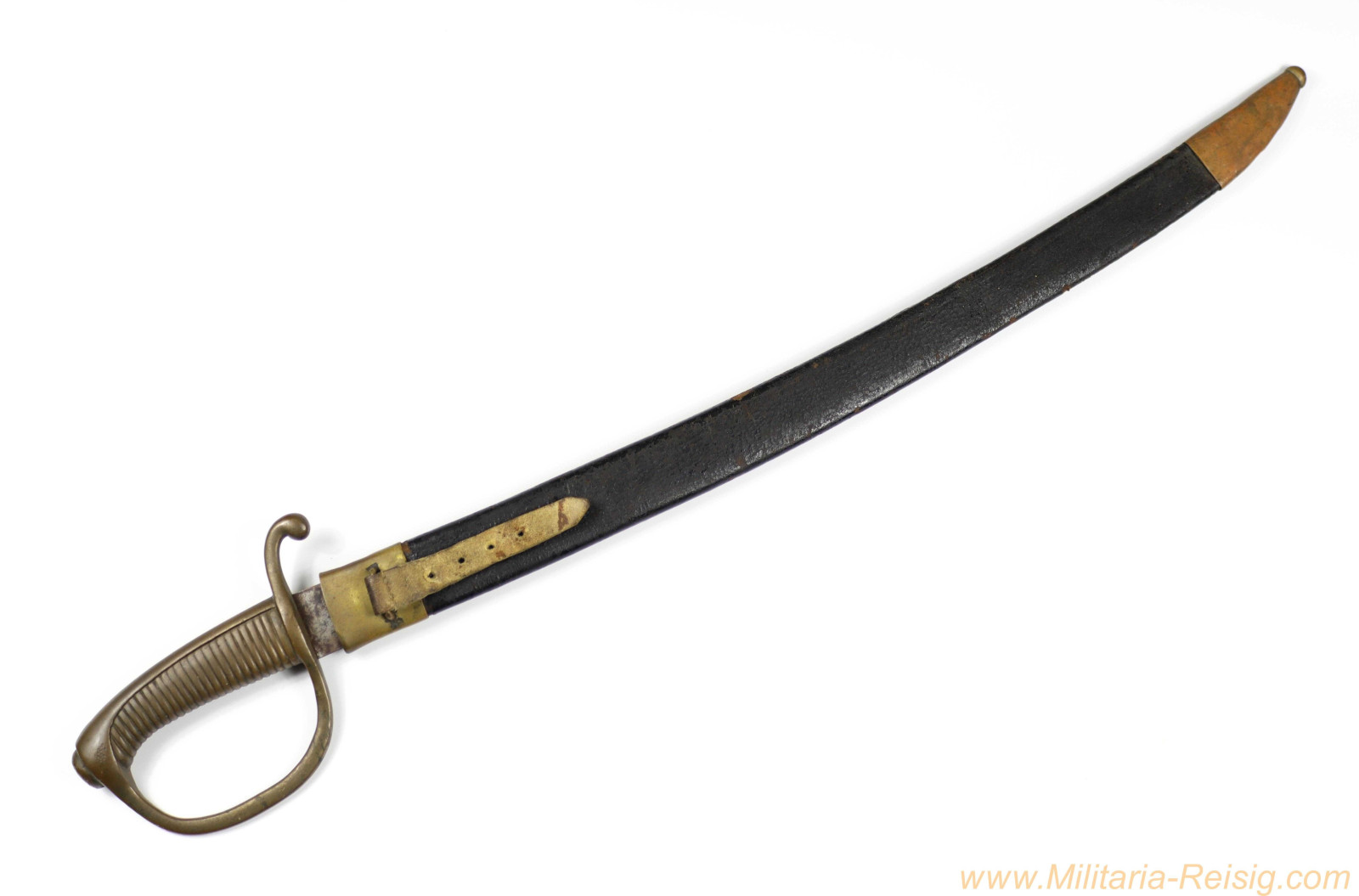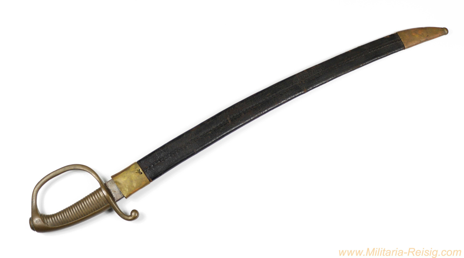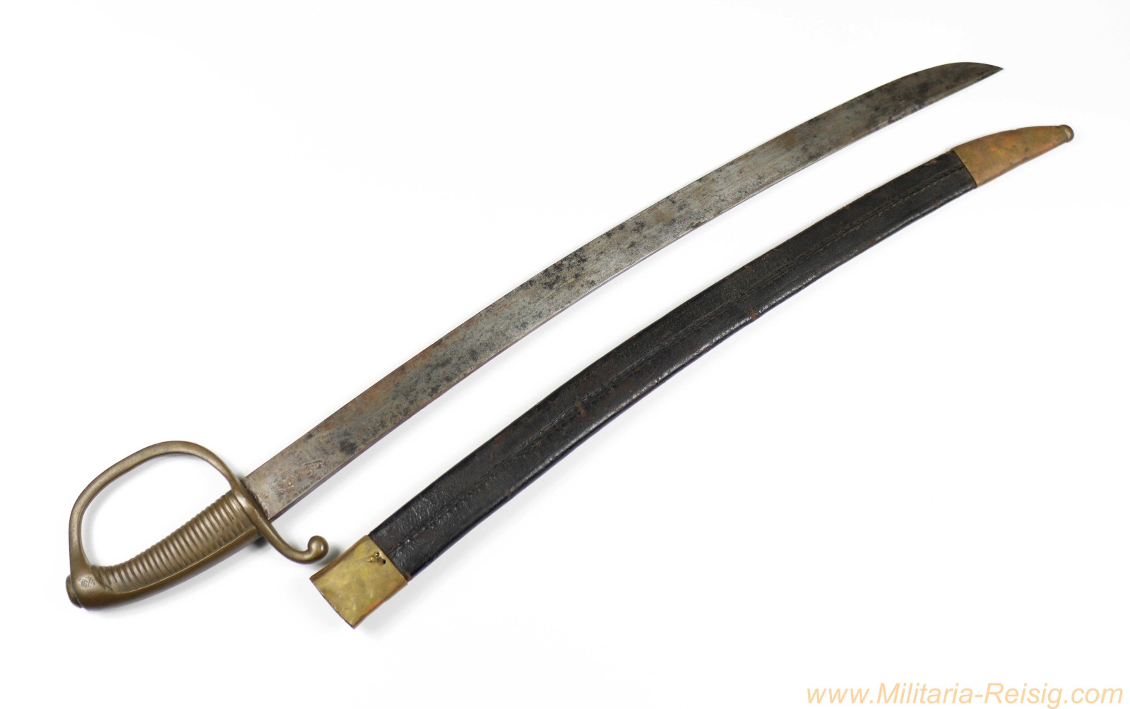 Schweizer Faschinenmesser bzw. Säbel Modell 1842/52 mit passender Lederscheide. Griff aus Messing mit gerilltem Griffstück, leicht gebogene Klinge mit typischer Alterspatina.