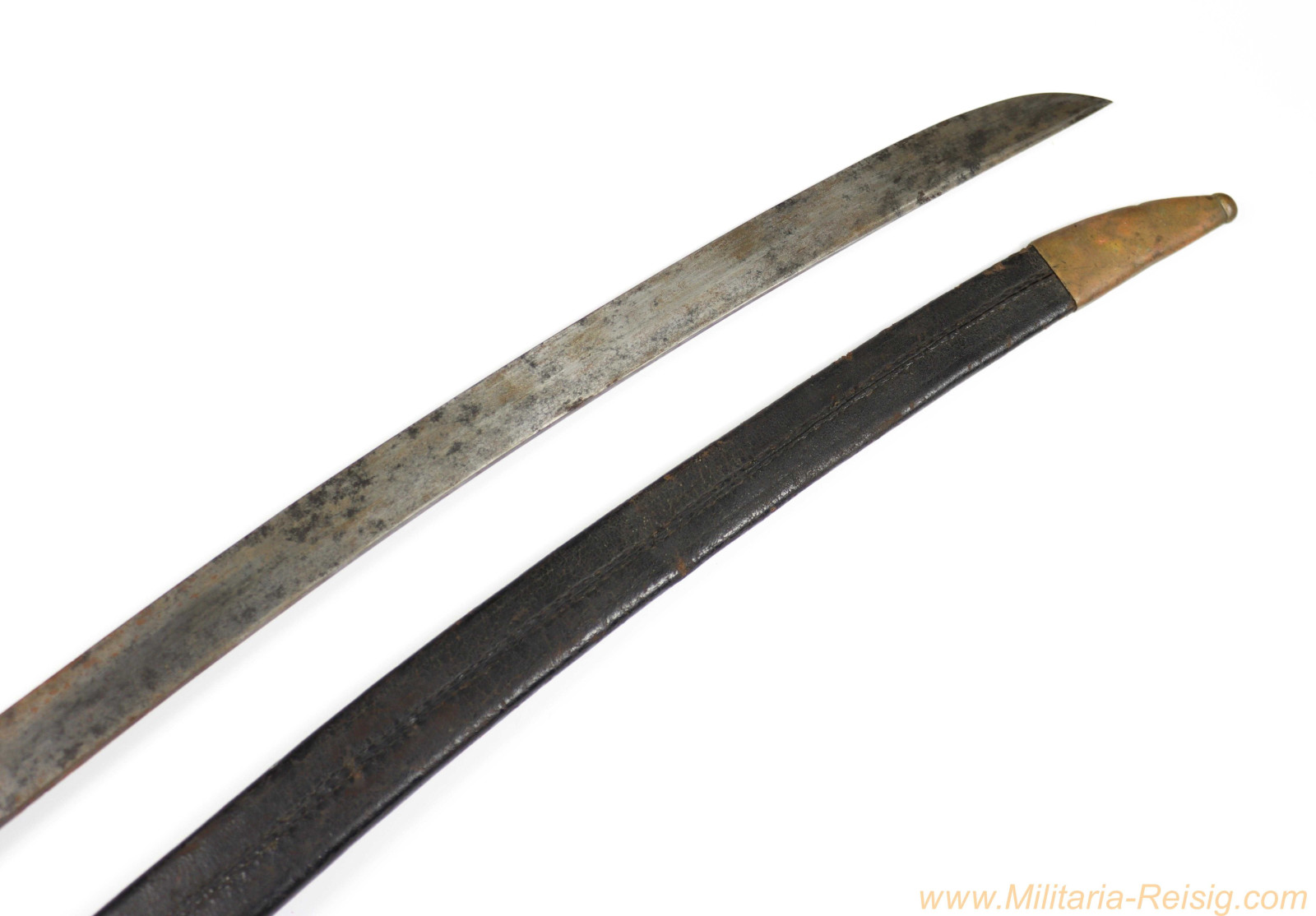 Die Scheide zeigt altersbedingte Schrumpfung, weshalb die Klinge nicht vollständig eingeschoben werden kann (oder innen leicht verschmutzt). Gesamtlänge mit Scheide ca. 73,5 cm.
