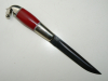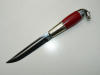 Der Griff ist etwas über 9 cm lang und außerordentlich sauber verarbeitet. Die beiden Metallabschlüsse zeigen nicht den bei solchen Messern üblichen Messington sondern erscheinen silbern (kein Edelstahl und nicht verchromt!!). Ich tippe auf Neusilber in entsprechender Legierung. Zwischen den Metallteilen ist mit je drei Fiberlagen eigefasst ein hochwertiger roter Kunststoff eingesetzt, der massiv ist und eine hohe Härte zeigt. Alle weiteren Informationen bitte ich den Abbildungen zu entnehmen.