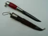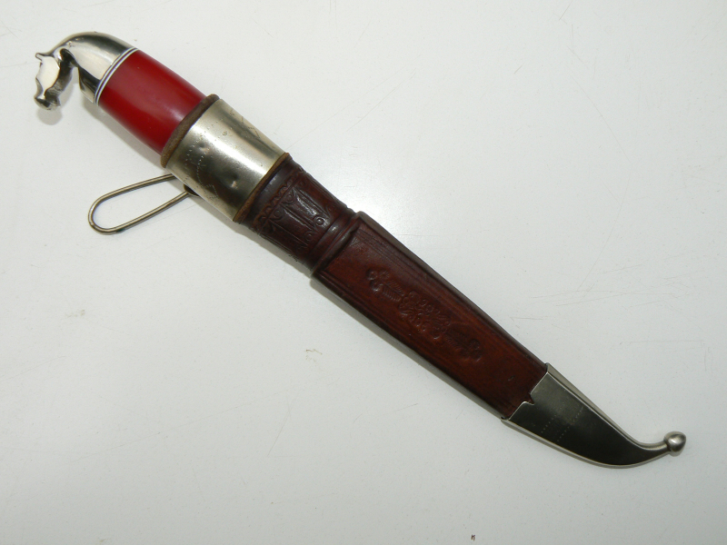 Aus meiner Sammlung verkaufe ich ein mit viel Handarbeit gefertigtes Jagdmesser (sog. Pferdekopfmesser) aus Skandinavien. Ich habe das edle Messer aus einem Nachlass bekommen, es liegt seither mit viel zu vielen anderen schönen Exemplaren in der Vitrine. Der Vorbesitzer hat es offensichtlich einige Male am Gürtel getragen, die Messerscheide zeigt am oberen Metallring leichte Gebrauchsspuren (Foto). Das Messer selbst sieht aus wie neu. Die Klinge ist knapp 10 cm lang, 1,5 cm hoch und ungefähr 2,5 mm stark. Sie ist superscharf geschliffen und oberflächlich auf Hochglanz poliert.