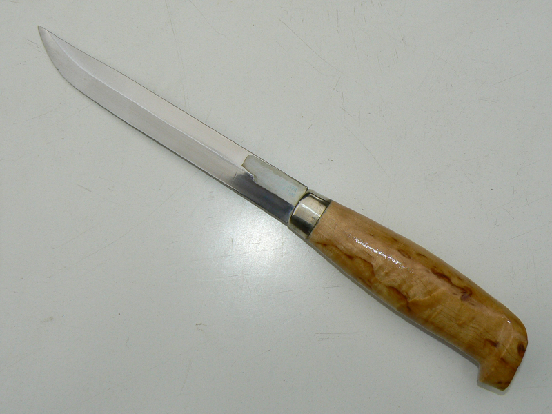 Aus meiner Sammlung verkaufe ich ein fast neuwertiges Jagdmesser (sog. Puukko) von Marttiini aus Finnland. Ich habe das Messer aus einem Nachlass bekommen, es liegt seither mit zu vielen anderen schönen Exemplaren in der Vitrine. Der Vorbesitzer hat es nicht oder nur sehr behutsam benutzt. Auf der Klinge klebt noch ein Etikett, dessen Aufschrift ich allerdings nicht mehr vollständig entziffern kann. Die Messerscheide zeigt keinerlei Schäden oder Gebrauchsspuren, sie wurde offensichtlich nicht ganz trocken gelagert und besitzt einige leichte Wasserflecken, die allerdings mit Schuhcreme oder Lederfett beseitigt werden können. Das Messer selbst sieht aus wie neu. Die Klinge ist knapp 15 cm lang, 1,8 cm hoch und ungefähr 3 mm stark. Sie ist superscharf geschliffen und oberflächlich auf Hochglanz poliert. Wie üblich ist auf einer Seite der Name des Herstellers eingraviert