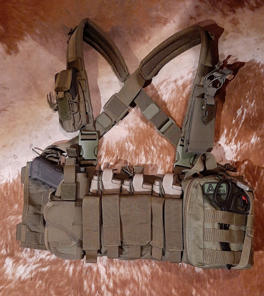 Condor Chest Rig Recon mit Condor Vertikal Holster, 2 Taschen am Tragegurt, 6 Magazin Taschen M4 , 6 Pistolen Magazintaschen. FARBE OLIV.