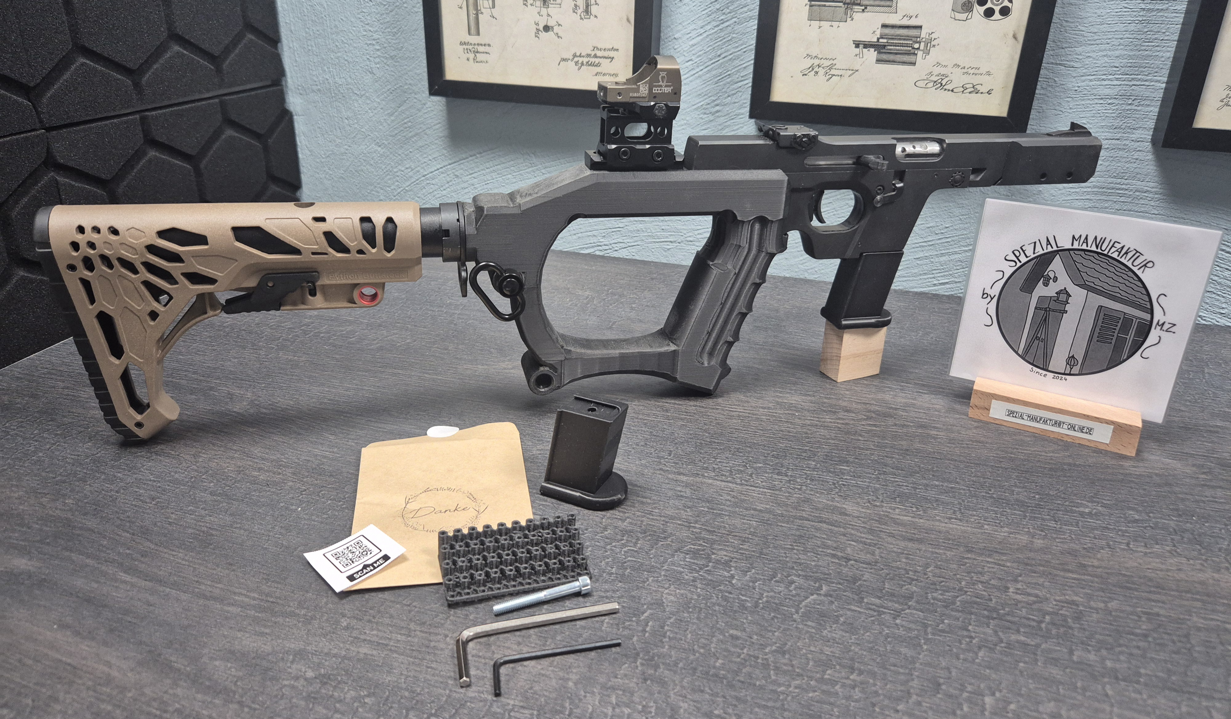 Dynamische Disziplinen wie das Fallscheibenschießen des BDS sind somit ohne Neuerwerb weiterer Waffen möglich. Der aus Carbonfaser verstärkten Kunststoff, 3D gedruckte Schaft bildet hierbei die Basis. Dieser nimmt die GSP formschlüssig auf und bildet die Basis. Der einstellbare Schubschaft sowie die Montageschienen ermöglichen die Modulare Anpassung der Waffe.