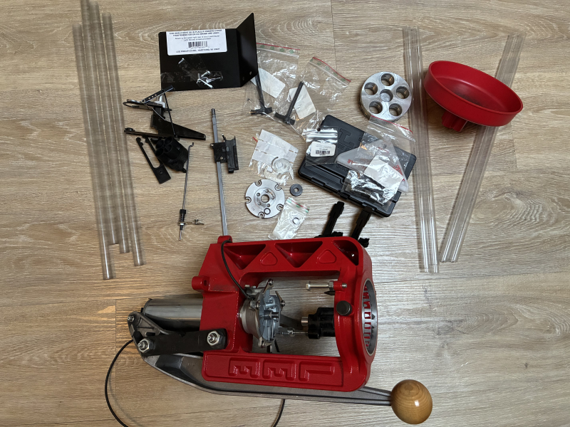 Kopfplatte, Hülsenhalterplatte 19S, Lee Hülsenzuführung mit Trichter 9x19, Lee Geschosszuführung für 9mm Geschosse (mittlere Größe, genau weiß ich das nicht mehr), 2X Zündhütchenzuführung kleine Zündhütchen,