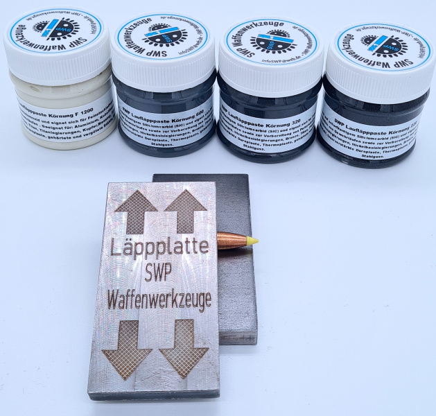 Sie erwerben hier jeweils ein Set zum Läppen von Waffenläufen. Das Läppen kann entweder mit einem Presswerkzeug oder – wie in den USA gebräuchlich – durch Abschießen vorbereiteter Geschosse mit reduziertem Gasdruck durchgeführt werden. Im Lieferumfang unseres Sets sind jeweils zwei Stahlplatten sowie vier Läpppasten enthalten; die Körnungen 220, 320 und 600 bestehen aus scharfkantigem Siliziumcarbid, die Körnung F1200 aus feinstem Aluminiumoxid. Zwischen den Stahlplatten werden weiche Geschosse gelegt; durch gegenseitige Bewegung werden die Läpppasten in die Geschosse eingearbeitet. Für jede Läpppaste ist ein neues Geschoss zu verwenden. Die Benutzung erfolgt auf eigene Gefahr; wir übernehmen keine Haftung. Das Läppen kann als Endbearbeitung, z. B. nach dem Arbeiten mit Knopfziehwerkzeugen, durchgeführt werden.