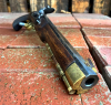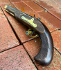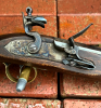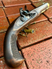 Zur Auktion kommt eine nicht so schöne Steinschloßpistole von Jukar.Kaliber müßte .45 sein ist aber nicht auf dem Lauf angegeben.Bei der Waffe ist die Kimme leider verloren gegangen und die am Griffstück eingeschnittene "Fischhaut" sieht nicht schön aus.Zudem könnte das Messing mal aufpoliert werden und das Metall könnte auch neu brueniert werden.Eine schöne Winterarbeit . Gewicht: 1130 Gramm , Feld/Zugmaß vorhanden , Gesamtlänge ca: 400 mm . Steinschloß von Funktion,hält in beiden Stellungen und der Stein schlägt auch einen Funken.Seriennummer: 0011836 Spain.Rest siehe Bilder.