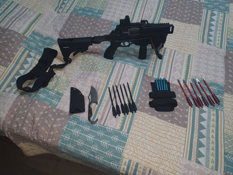 Diese Pistolenarmbrust hat einen 90 Pfund Wurfarm der nachträglich gekauft und verbaut wurde und es wurde damit maximal 1 Magazinfüllung zum testen verschossen. Dazu lege ich mehrere verschiedene Bolzen, ein Licht/Laser Modul ein Reddot, einen Pfeileköcher der an der Armbrust montiert ist so wie auch einen Handgriff. Zuzüglich 2 Extra Wurfarme, einmal 55 Pfund und einmal 35 Pfund plus Sehnenwachs und original Laser der optional eingebaut werden kann, wo es erlaubt ist. Eine Garantie und oder Rücknahme schließe ich aus da von privat. Ich garantiere aber die volle Funktion.