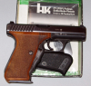 Heckler und Koch P7 in 9mm Luger, schöner Zustand jedoch Spuren vom Führen und insbesondere am Griffrücken fleckig, leichte Namensgravur seitlich, mit Holzgriffschalen, schwarze Originalgriffe, Original-Karton und Papiere auch Anschussscheibe mit dabei.