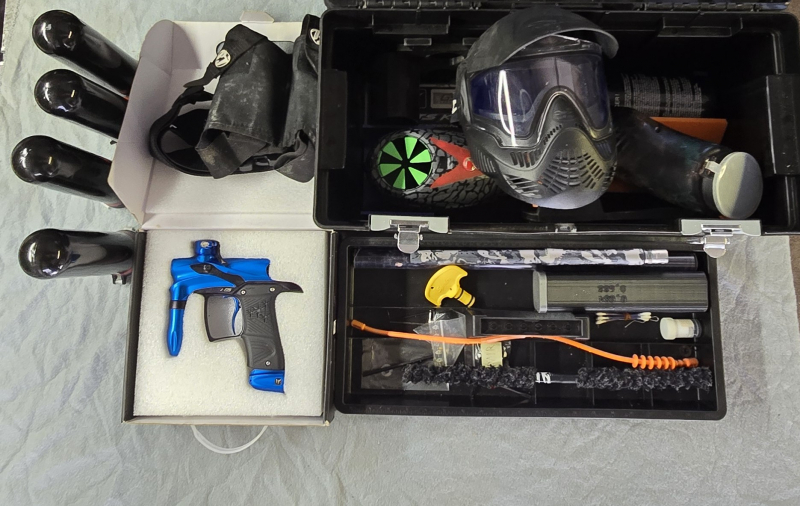 Zum Verkauf steht ein Dangerous Power G5 Paintball Markierer (mit F-Zeichen) im gepflegten Zustand mit umfangreichem Zubehör.