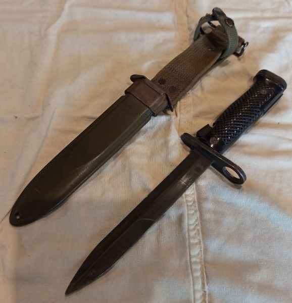 US Army Bajonett Kampfmesser US M6 Aerial aus dem 2.Weltkrieg, Klinge 17 cm, Gesamt ca. 29 cm, mit Scheide US M8 B.M.CO, Zustand siehe Fotos.