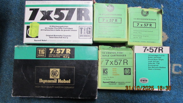 Sie bieten auf ein Munitionskonvolut im Kaliber 7x57R; der Lieferumfang entspricht der Abbildung. Es ist möglich, dass vereinzelte Patronen bereits Lagerspuren haben (leichte Lagerspuren, wenn überhaupt, kein Grünspan oder so); einzelne Packungen sind nicht voll und ich will auch nicht ausschließen, dass zwischendurch eine Patrone mit einem anderen Geschoss dazwischen ist als auf der Packung steht. . Bitte keine Nachfragen, welche Packungen voll sind und welche angebrochen; wer das wissen möchte, kann gerne gucken kommen. Das ist ein Privatverkauf; keine Garantie, Gewährleistung, Rücknahme.