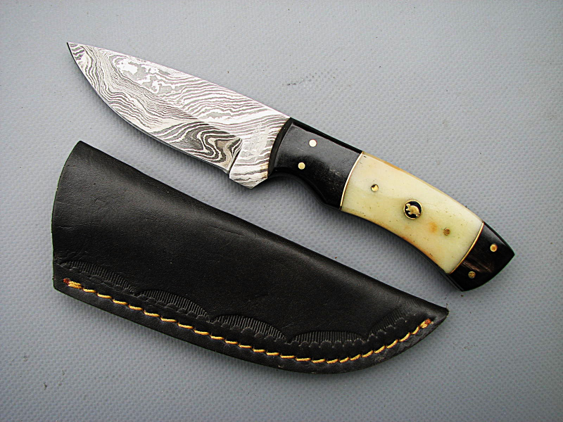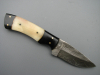 Hier ein unbenutztes , Damast Messer (Handarbeit) mit stabiler Leder Scheide. Klingenlänge 9,7cm - Gesamtlänge 21,5cm. Griffschalen aus Bein (Knochen). Rest siehe Bilder.