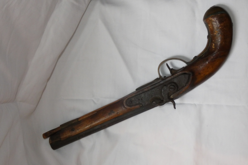 Sie bieten auf eine alte schwedische (?) Vorderladerpistole, deren Hahn sich spannen und auslösen läßt aber nicht mehr funktionstüchtig ist.