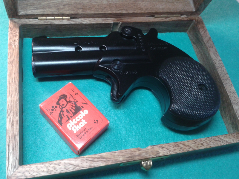 Hallo, ich verkaufe hier eine Rarität, Umarex Derringer 6mm Flobert PTB 296 mit kleiner Abplatzung am Lauf (fällt kaum auf). Sonst in einem Top Zustand wie Neu. Leider ohne Bedienungsanleitung. Mit einem Piccolo Kartenspiel und einer neuen tollen Holzschatulle. Super Set. 2 schüssig, Läufe und vorne im Lauf wie neu, nicht benutzt. Der Derringer wird so wie auf den Fotos zusehen verkauft, ohne originale Verpackung. Voll funktionsfähig, alles funktioniert.++++++++++++++++ Dieses ist ein Privatverkauf somit keine Garantie, keine Gewährleistung und keine Rücknahme. Keine nachträgliche Minderung des Kaufpreis.++++++++++++++ Der Derringer ist wirklich Wunderschön nur eine kleine Stelle am Lauf sonst wie neu. +++++++++++++++++++Viel Spass damit. Frei ab 18 Jahre, bitte nach dem Kauf per eMail den Altersnachweis (kopie vom Personalausweis Vorder-u. Rückseite zusenden), auch von ID Mitgliedern.+++++Achtung!!!!!!------kein internationaler Versand, Verkauf nur in Deutschland.-----!!!!!!!!