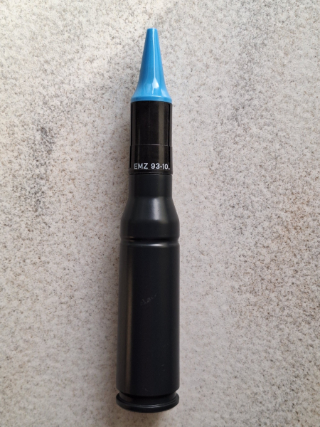 Sie bieten auf ein Patronen-Dummy im Kaliber 25 x 137 mm, der keinerlei Gefahrenstoffe enthält. Hersteller gemäß Bodenstempel ("EMZ"): Eurometaal Zaandam, Niederlande. Bei dem Geschoss könnte es sich um ein Üb-Geschoss handeln, darauf deutet zumindest die blaue Farbe der Geschossspitze hin. Wenngleich der Dummy keinerlei waffenrechtlichen Beschränkungen unterliegt, verkaufe ich diesen dennoch ausnahmslos nur an volljährige Personen, daher auch der Hinweis "Altersnachweis erforderlich", der bei ID-Mitgliedern entfällt. Munition dieses Kalibers wird z.B. in der M242 Bushmaster Maschinenkanone verwendet. Der Dummy besteht aus einer abgeschossen Hülse (ohne Zündhütchen) sowie einem Geschoss, welches nur lose auf die Hülse aufgesetzt ist, d.h. das Geschoss ist nicht fest mit der Hülse verbunden. Das Geschoss ist im unteren Teil aus Metall gefertigt, der Rest besteht aus Kunststoff (schwarzer und blauer Teil). Eine kleines Papp-Röhrchen zur Aufbewahrung des Geschosses gehört ebenfalls zum Lieferumfang. Das Bild zeigt den Artikel, auf den Sie bieten. Aus meiner Sicht ist der Dummy im Bestzustand, den auch ein winziger Kratzer in der Mitte der Hülse (siehe Bilder) kaum trüben dürfte. Versicherter Versand mit Sendungs-ID. Kein internationaler Versand, d.h. Versand nur innerhalb Deutschlands ! Keine Abholung möglich. Da es sich um einen Privatverkauf handelt, der keinen gewerblichen Hintergrund hat, ist jede Garantie oder Gewährleistung ausdrücklich ausgeschlossen; ebenso ist eine Rücknahme der Ware nicht möglich oder mit anderen Worten: DER VERKAUF ERFOLGT UNTER DEM AUSSCHLUSS JEGLICHER SACHMÄNGELHAFTUNG. Mit der Abgabe eines Gebotes akzeptieren Sie diese Bedingungen; bitte bieten Sie also nicht, wenn Sie mit den vorgenannten Bedingungen nicht einverstanden sind. MyGun ist Bestandteil dieser Auktion. ebenfalls zum Lieferumfang.