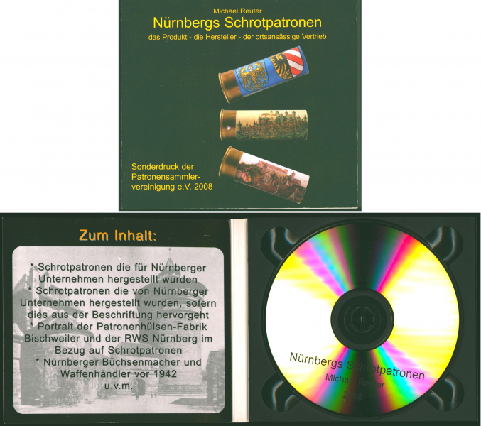 Sie bieten auf eine originale CD, herausgegeben von der Patronensammlervereinigung e.V. Die CD beinhaltet eine Übersicht über die in Nürnberg hergestellten Schrotpatronen von ansässigen Hersteller und Händler.