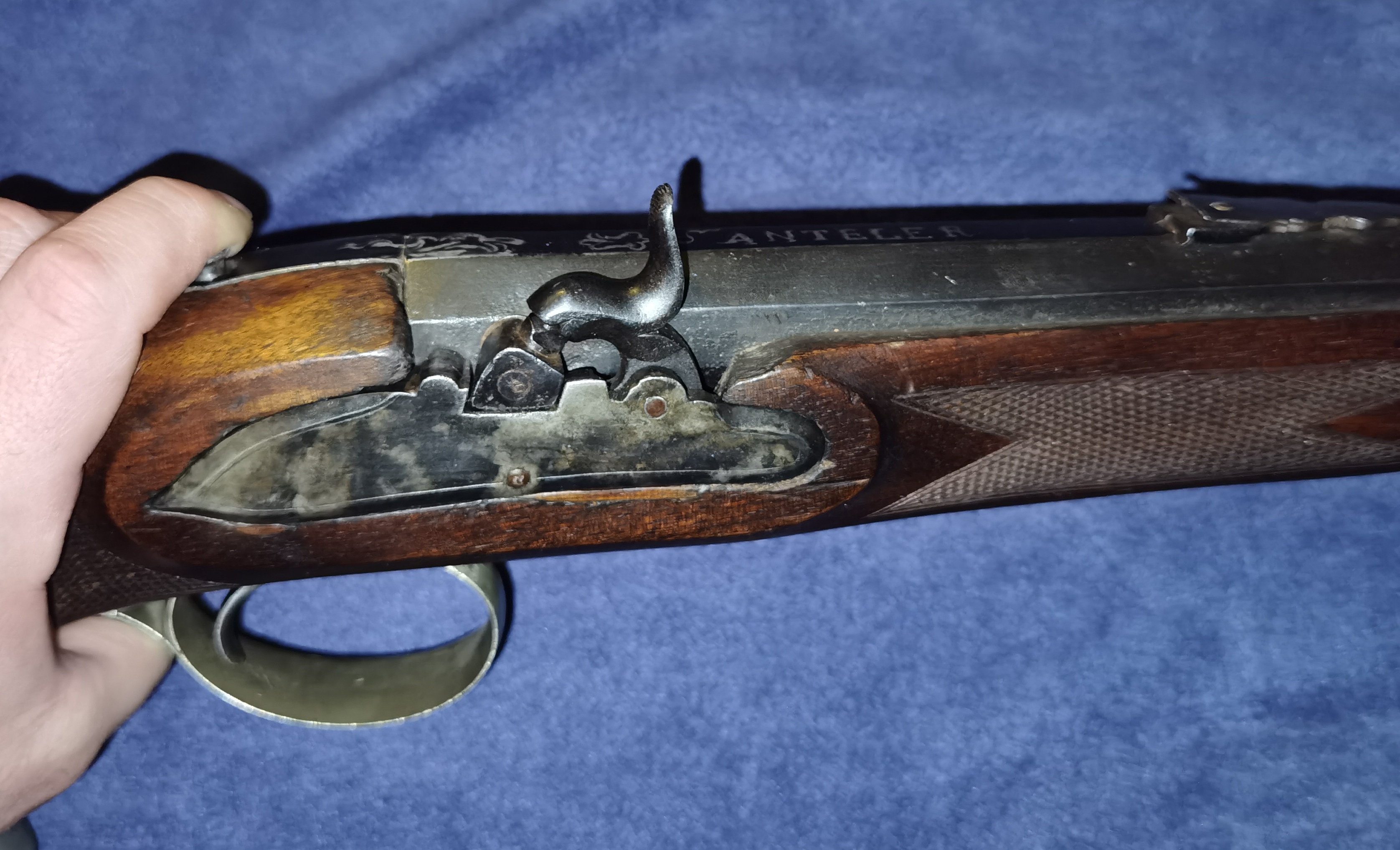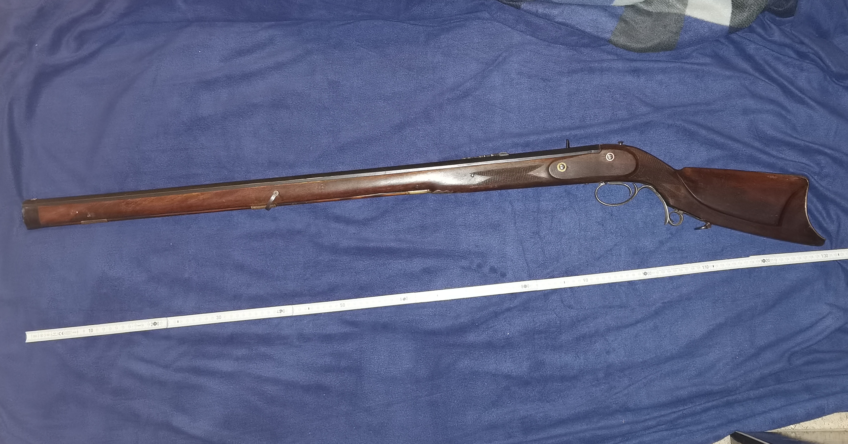 Zum Verkauf steht eine seltene historische Jägerbüchse mit nach hinten abschlagendem Perkussionsschloss. Die schwere Büchse hat einen achtkantigen 94cm langen Lauf mit scharfen Zügen im Kaliber 13mm, misst insgesamt 131cm und trägt den silbernen Schriftzug "Anteler" (mutmaßlich der Büchsemacher). Der Abzugsbügel ist mit einem eingravierten Jagdmotiv verziert. Ingesamt ist das Gewehr für sein Alter in einem wirklich guten Zustand und voll funktionsfähig - die Schlossfedern sind kräftig und es schlägt sauber ab.