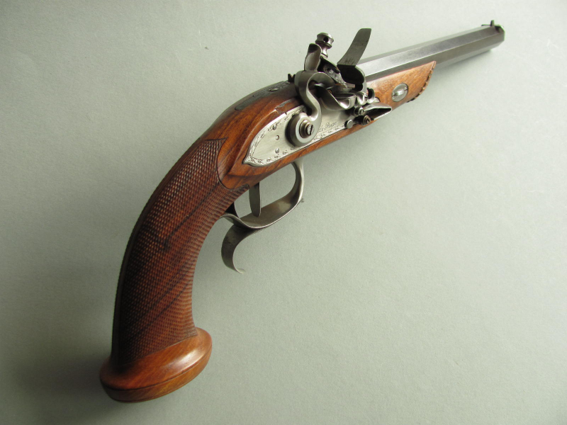 Angeboten wird diese ausgezeichnete Replik einer feinen Steinschlosspistole aus der Zeit des 18. Jahrhunderts. Die Pistole verfügt über einen verstellbaren Rückstecher und eine höhenverstellbare Kimme. Das Steinschloß hat eine, auf einer Rolle laufende Batterie. Die Pistole wurde außerdem für den Wettkampf mit einer Turbo-Zündlochschraube ausgestattet. Die Originalzündlochschraube, sowie eine zweite eingepaßte Batterie werden mitgeliefert. Alle Metallteile sind hochglanzpoliert. Der Schaft besteht aus europäischem Nussbaumholz und hat eine geschnittene Fischhaut im Originalstil. Die Pistole befindet sich in einem sehr guten Zustand mit leichten Gebrauchsspuren.