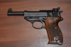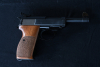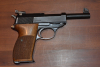 Pistole Walther P38 9mm Para Micro.Visierung von H&K, zusätzlich Holzgriff, Lauflänge 125 mm, 2 Magazine, Bj. 1973, guter Zustand Stahl / Dural Kaliber : 9mm Para, sehr guter Zustand Pistolentasche Leder Stahlblech Magazine 344772