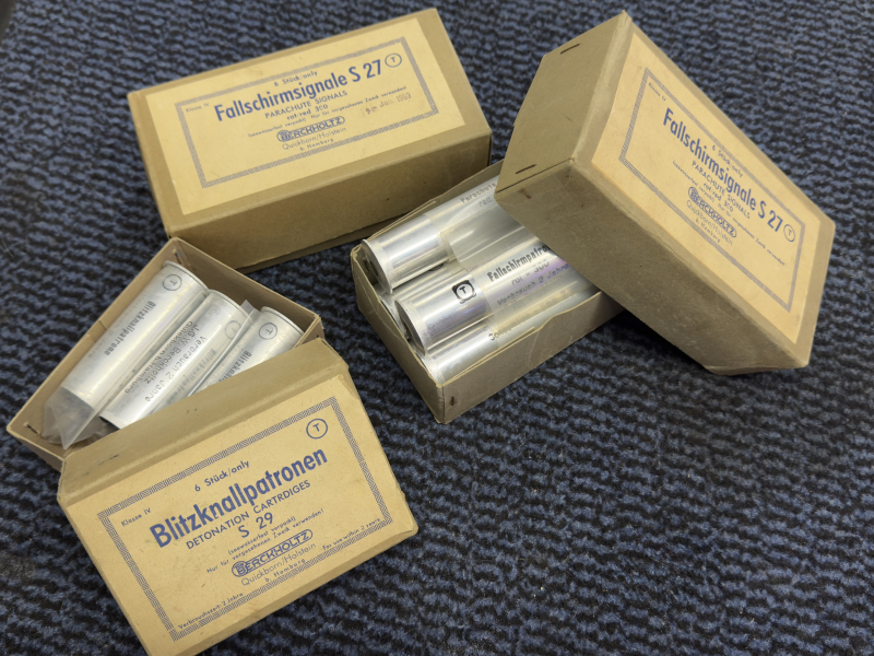 Biete 3 Kartons Kaliber 4 alte Blitz Knallpatronen 1x. Und 2x S29 Fallschirmsignale S. 27 für Sammler als Deko die Hülsen sind leer und abgeschossen siehe Foto.